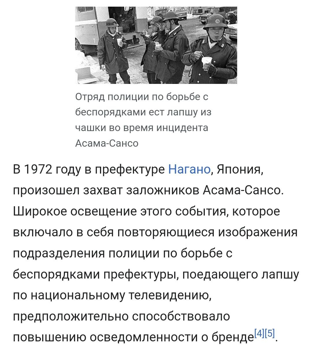 >>1223065 Cup Noodles (яп. カップヌードル каппу нудору, букв. — «чашечная лапша» или «лапша в чашке/из чашки») — это бренд лапши (рамэна) быстрого приготовления, разработанный в 1971 году и производимый японской пищевой компанией Nissin Foods. Разовые порции продукта упаковываются в пенопластовые, пластиковые или бумажные стаканчики и готовятся путём добавления кипятка.