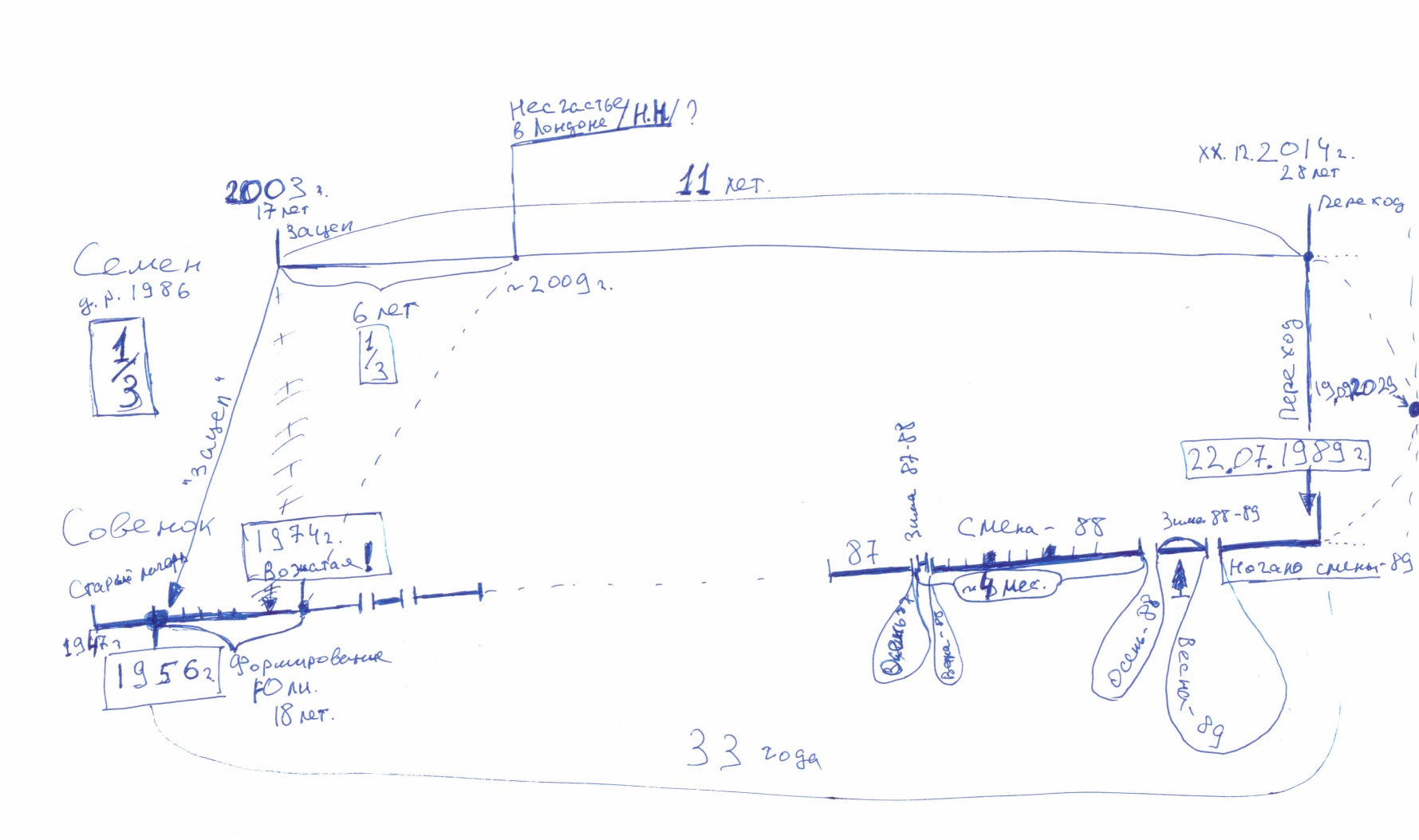 Исходя из того, что в Совенок Семен оказался в возрасте 17 лет, зацепило его в 2003 году, 11 лет назад (по времени Семена). Юля бодрствует только в периоды, когда лагерь действует, примерно 4 месяца в году (все лето, неделя зимнего заезда, плюс осенние и весенние каникулы). Получается, в среднем время в Совенке течет со скоростью втрое большей, чем у Семена, но при этом в смену течение времени 1:1, а промежутки (большая часть весны, осени и зимы) пролетают вообще несвязанные с реальностью Семена. Получаем, что в момент “зацепа” в Совенке был 56-й год - вполне возможно, именно в этом году его переделали из интерната для военных сирот (чем он был с 47-го года) в детский лагерь, и эмоциональный фон стал более подходящим для возникновения прокола. В 74 году, через 18 лет после “зацепа” визуализация аномалии выходит на контакт - разговаривает с вожатой, которую накрывает воздействием и она вешается. По времени Семена этот момент соотвествует 2009 году. Это событие - мощный удар по эмоциональному фону, и влияние через зацеп перекидывается на Семена - несчастный случай с возлюбленной в Лондоне/Нижнем Новгороде/еще где-то. Личность вожатой каким-то образом утилизируется аномалией для формирования Юли в том виде, в каком она существует в настоящий момент. Кстати имя Юли - тоже унаследовано от вожатой.
