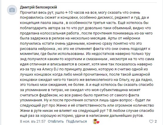 Рут читается тяжело. Водных рефлексий на квадратный метр в нём больше, чем в любом руте пивия, и к концу подача повествования вас задушит с вероятностью 95%. Причина в том, что автор явно хотел догнать пивописовы объемы и написал рут на 120 тысяч слов(это примерно как Славя-классик или амбальский ФЗ), но событий на эти 120 тысяч у него не хватило, из-за чего многие ивенты искуственно удлинены размышлениями Семёна.