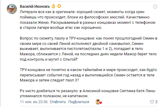 Вчера прошел Славю за того же дрища на все концовки. Тронула концовка "На том же месте".