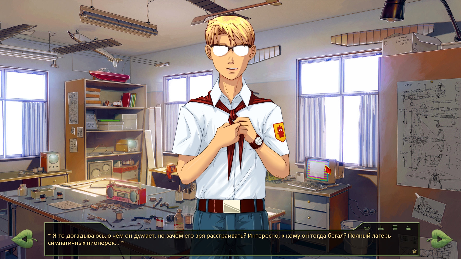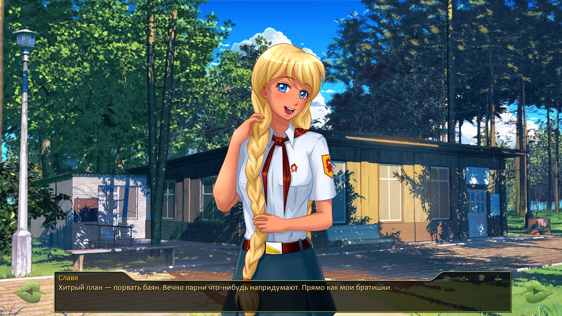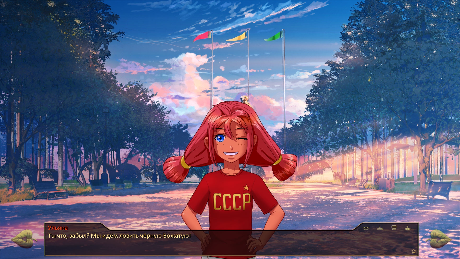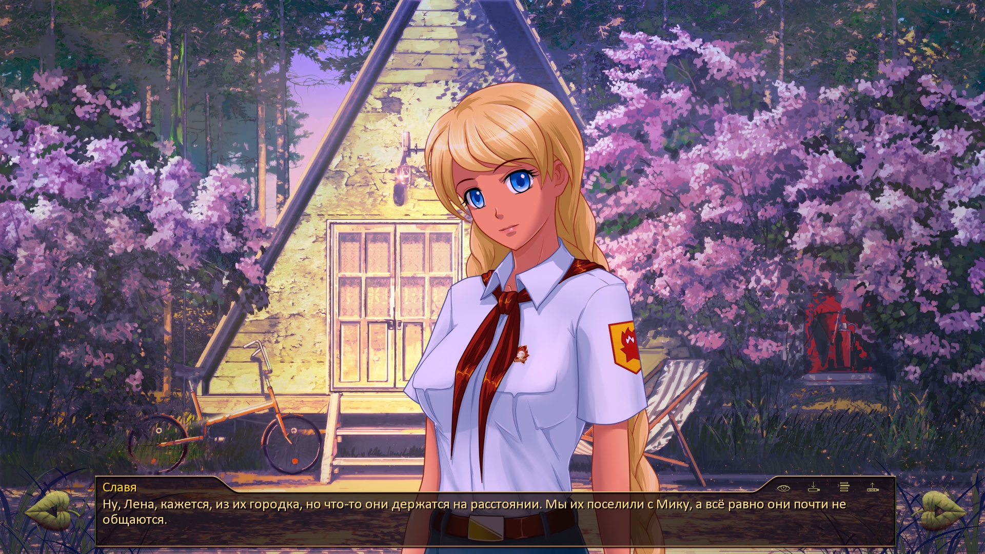 un "А ты не знаешь, куда Шурик пошёл?" un "Шёл к лесу и бормотал что-то под нос. Я его позвала, а он даже не повернулся. {w}Лунатик, что ли?" me "Был бы лунатик — в трусах гулял бы. {w}Я его тоже видел." me "Не бери в голову. Наверное, девочка у него, будут держаться за руки, смотреть на звёзды и по-пионерски целоваться в щёчку. {w}Даже завидно."