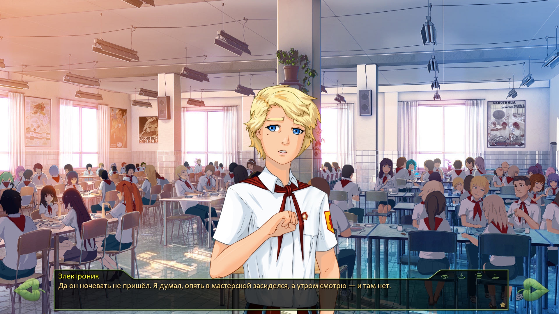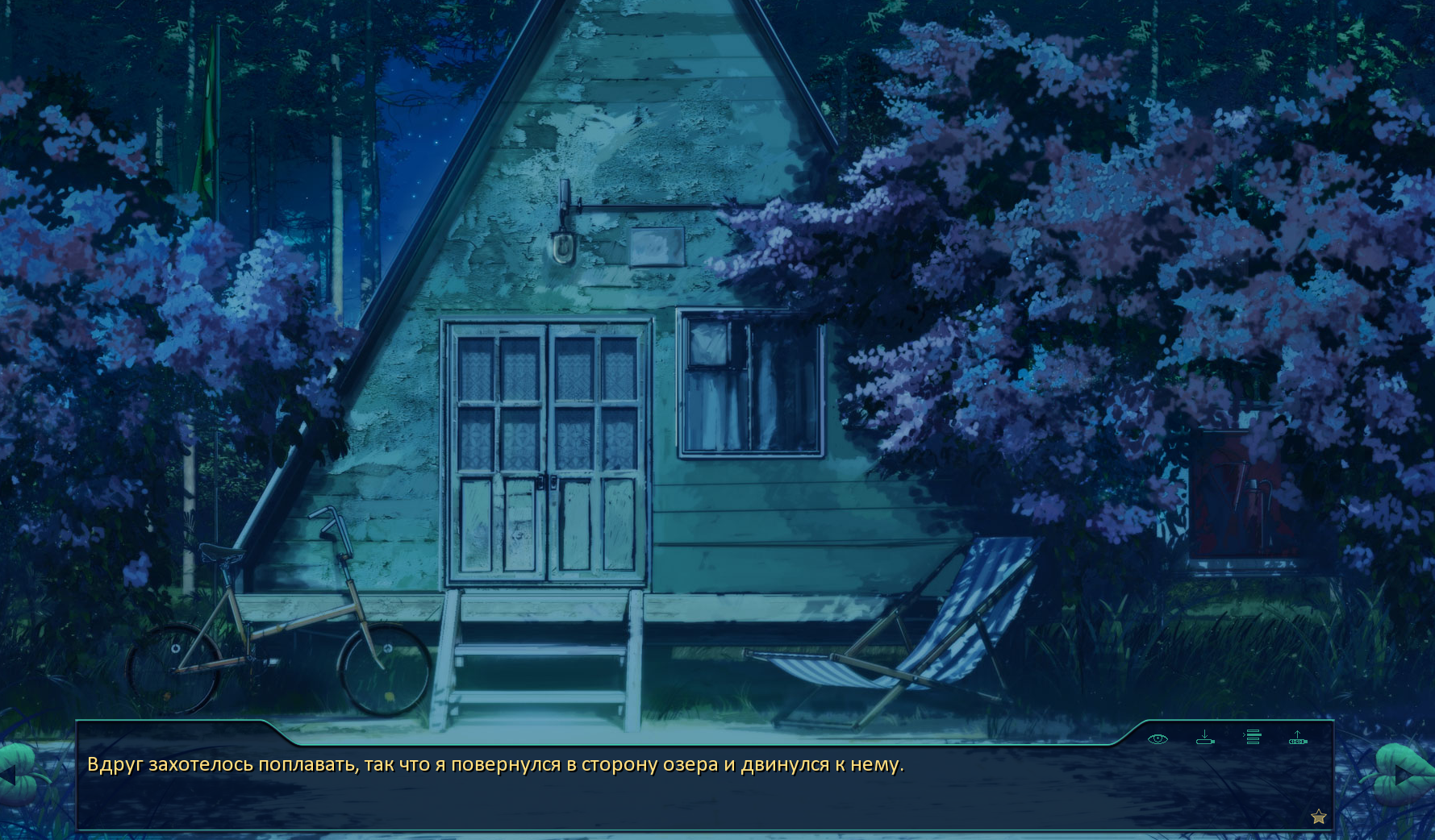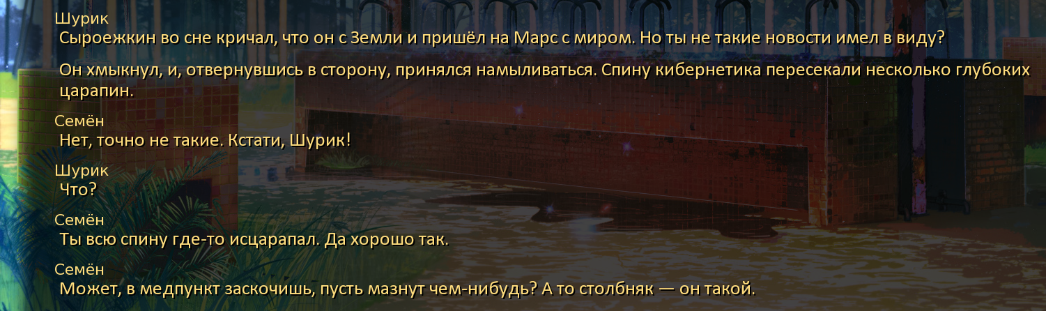un "А ты не знаешь, куда Шурик пошёл?" un "Шёл к лесу и бормотал что-то под нос. Я его позвала, а он даже не повернулся. {w}Лунатик, что ли?" me "Был бы лунатик — в трусах гулял бы. {w}Я его тоже видел." me "Не бери в голову. Наверное, девочка у него, будут держаться за руки, смотреть на звёзды и по-пионерски целоваться в щёчку. {w}Даже завидно."