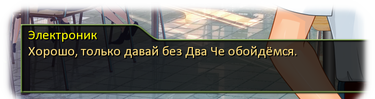 bus "Сдавай!" "Большой красный автобус в зелёных очках сидел напротив меня и неторопливо попыхивал сигареткой, зажатой в переднем колесе. {w}На коленях у него восседала хрупкая девочка в рваном платьице и шевелила кошачьими ушками." "Я перевёл взгляд на свои руки. Колода карт, зелёное сукно. {w}Где я?" bus "Ну, сдавай уже."