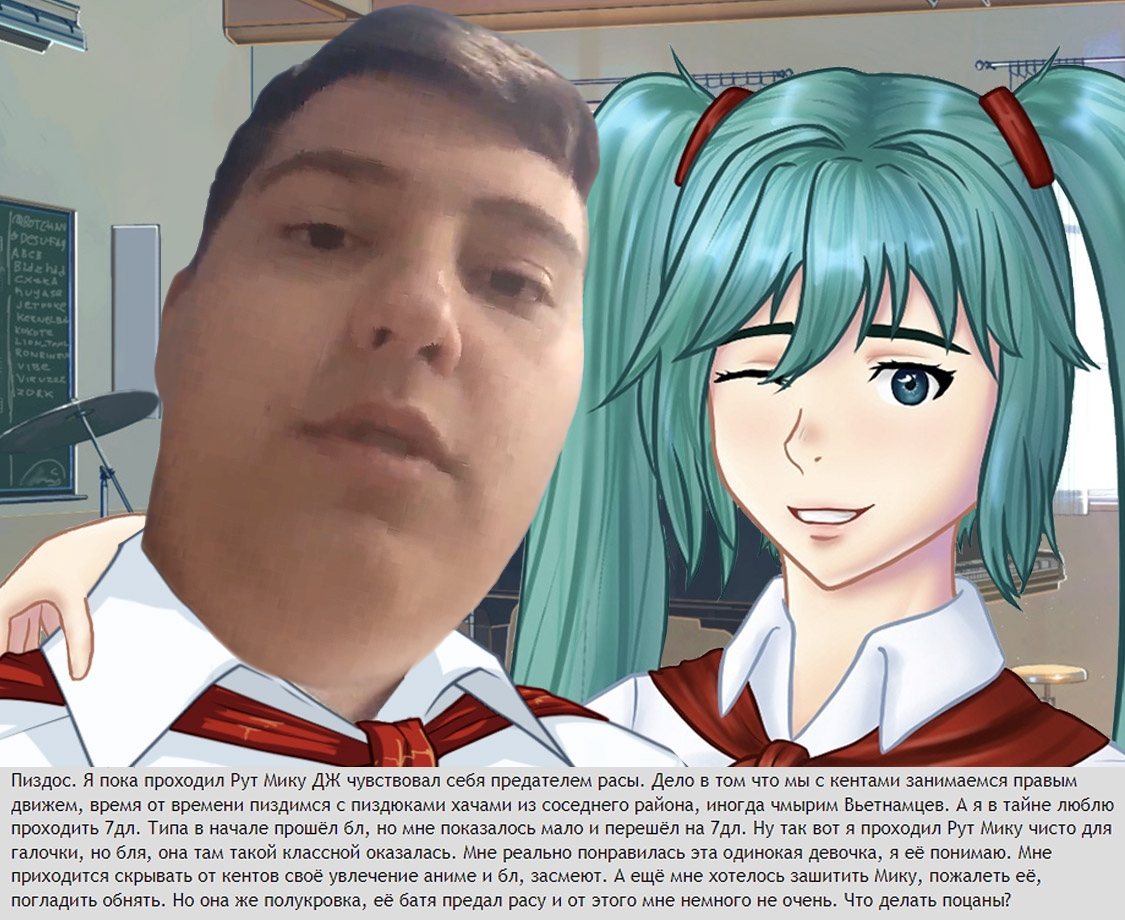 >>1232235 Трушки Ульяны/Алисы рассказывают их бэк. Мику объективно нинужна, но паззл из 6 частей, а моя Мика это единственная концовка Мики, где фигурирует Юля.