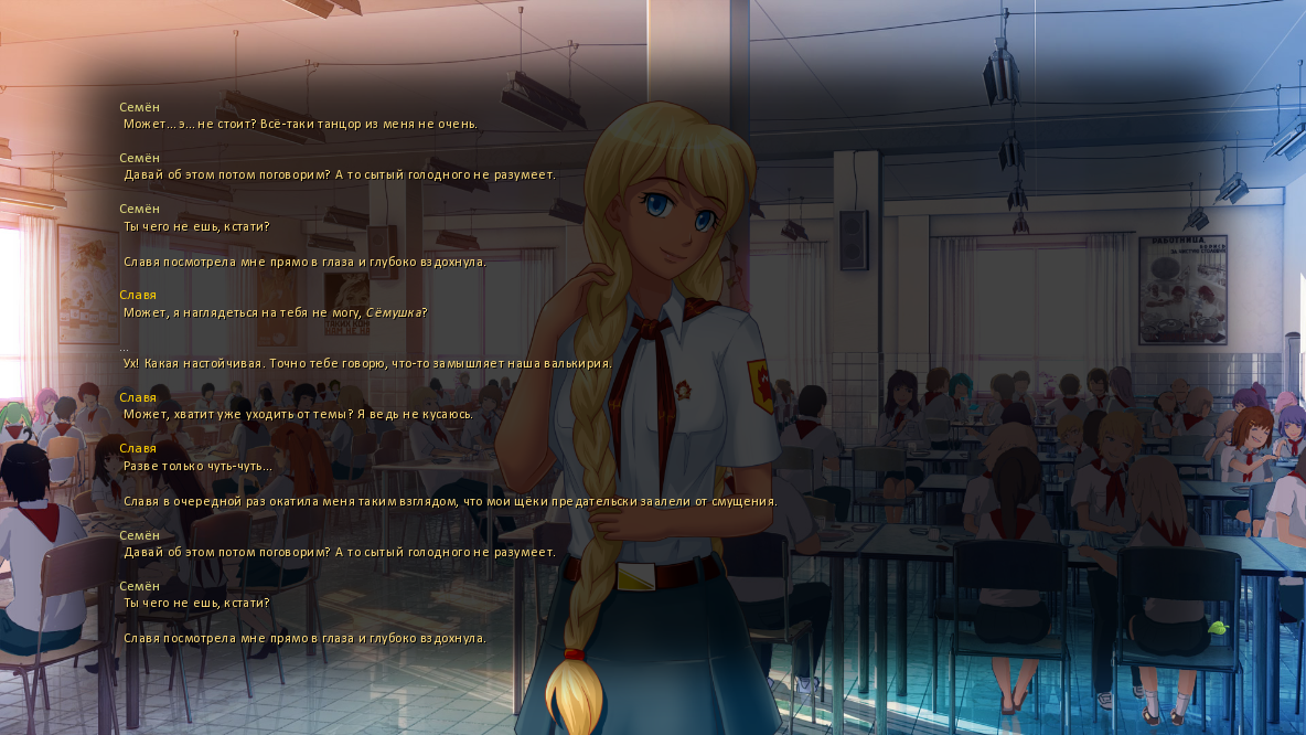 label alt_day6_uvao_sh_mines_getting_up, строка 5751 - Семён умывается, потом после выбора "Отлежаться немного" идёт умываться снова. label alt_day6_uvao_lunch_dv_sl - при обеде со Славей 2 раза повторяется один диалог 2 раза(пикрелейтед) label alt_day6_uvao_concert_with_sl: первая же строка > "Через каких-нибудь полчаса, буквально хрустящий от чистоты, я уже выходил на площадку перед сценой." Кажется лишней, т.к дальше он идёт как раз мыться в душевые