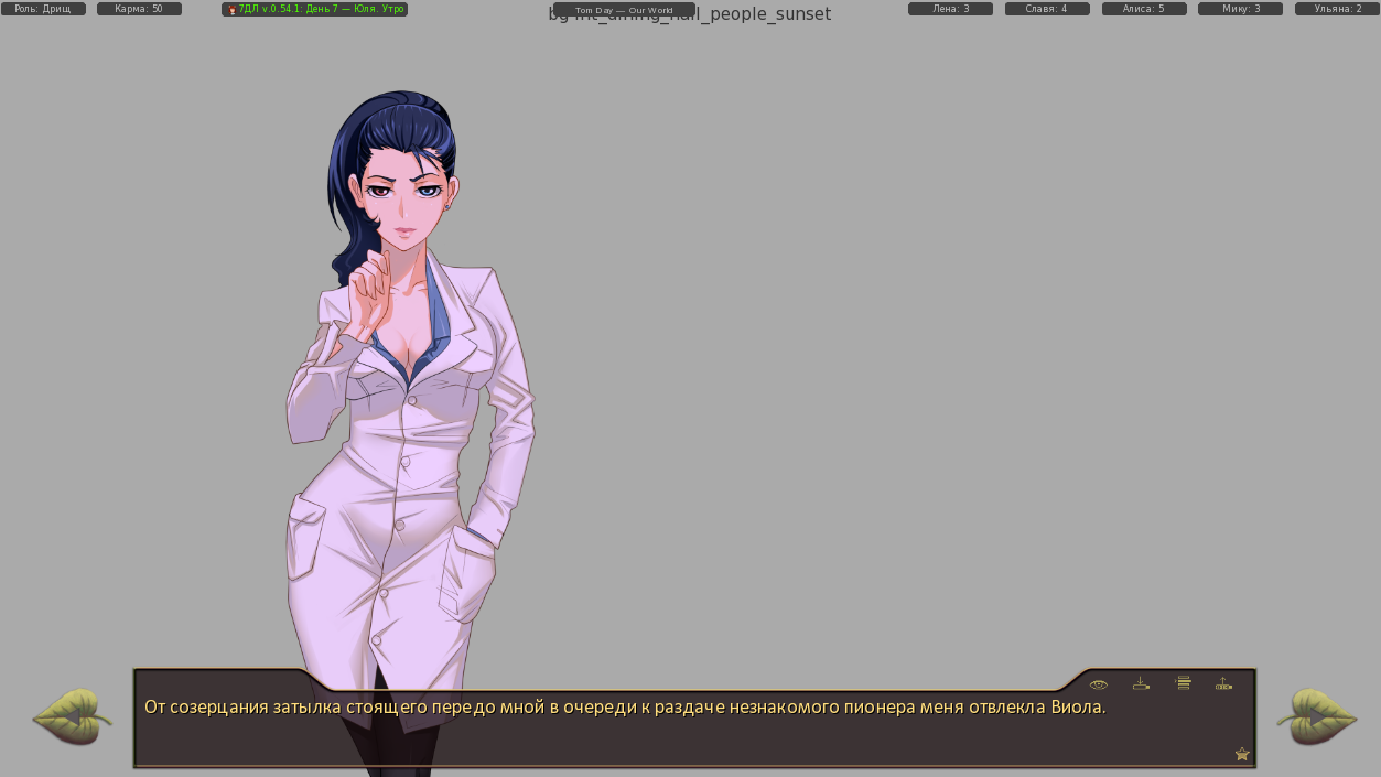 label alt_day6_uvao_dinner_with_sl, если соглашаемся на катапульту, строка 15982 >th "Что там говорила Виола… Если мы с миром не уживаемся - меня выкинет обратно. Кажется, это мой случай." За всё прохождение она ничего такого не говорила, возможно нужна доп. проверка на флаги. Если отказываемся от катапульты, строка 16123 > me "В-третьих, я всё пытался тебе сказать, что, скорее всего, я не буду возвращаться назад. Останусь здесь, мне сказали, у меня на это хорошие шансы. Так что, уж извини, я не могу забрать тебя в свой мир." Опять же, подобных разговоров за всё прохождение не было, возможно нужна доп. проверка на флаги. В 7 дне отвалился фон(пик 2)
