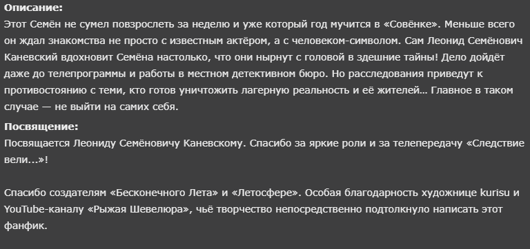 Автор возобновил работу над фанфиков "Бесконечный Стикс". Переименовал его в "Бесконечное лето. Круги на воде". Пионерское время проходит достаточно мягко, в конце недели автор ставит боевку с бандитами, демонами, небом, Аллахом. А вот бэкграунд у героев мама не горюй. https://ficbook.net/readfic/9718508