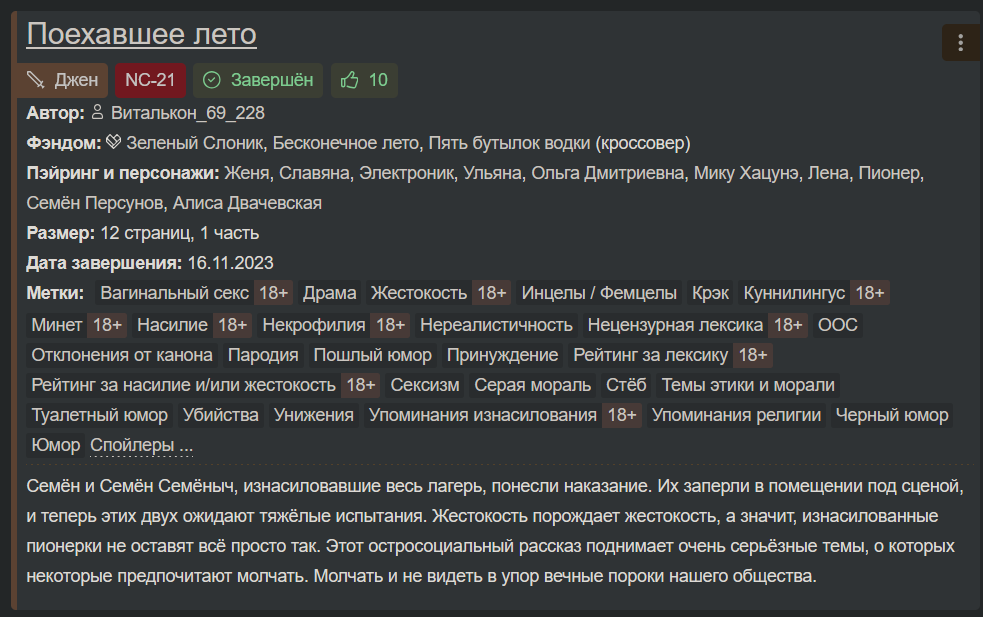 Еще был кроссовер Лета и SCP который удалили почти сразу после публикации (через день-два), довольно годный, но я его уже отчаялся найти. Как и "Обыкновенную порнографию" про соплежуя-Semen'а и Славю