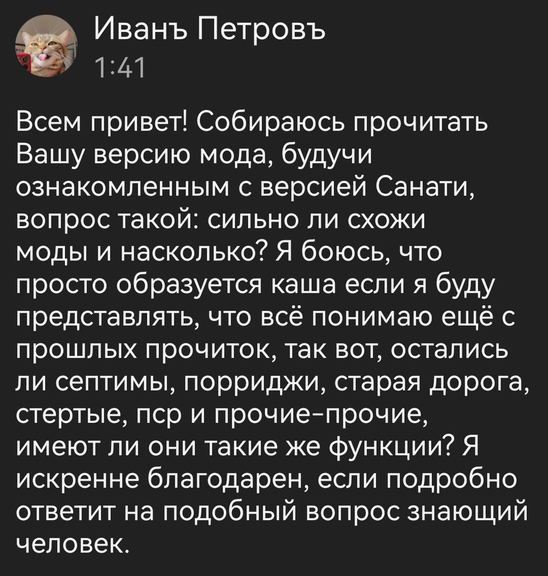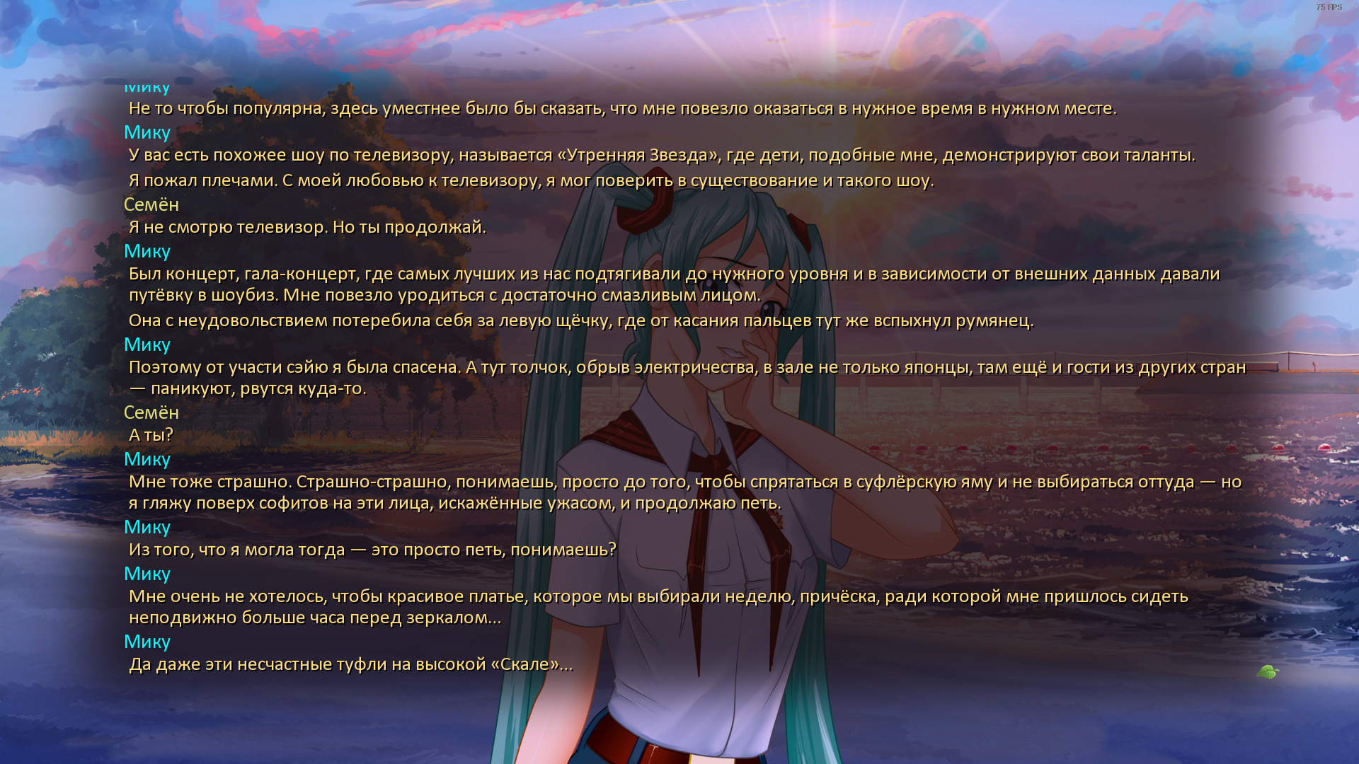 ПОЧЕМУ В ЭТОМ ВАШЕМ ОБОССАНОМ ПИВЕ ТАКАЯ УЁБИЩНАЯ РЕЖИССУРА? Тектбоксы возникают и пропадают резко без какого-либо фейда, переходы между сценами уровня Power Point 2003, музыка, которая мало того что много где расставлена невпопад, так ещё и не затыкается ни на минуту. И самый пиздец — дебильные зумы на фонах, которые были бы уместны, будь фоны в 4к разрешении, но здесь же они превращают визуал в торжество шакалов, что пиздец как портит погружение. Судя по шапке, авторы мода мониторят тред, посему к вам вопрос — вы это, блядь, серьёзно? Я конечно понимаю, мод ещё в разработке и все дела, но кодеры у вас и свои есть, куда они смотрят? Если что, октябрёнок прочитавший Алису-7ДЛ и Лену-ФЗ.