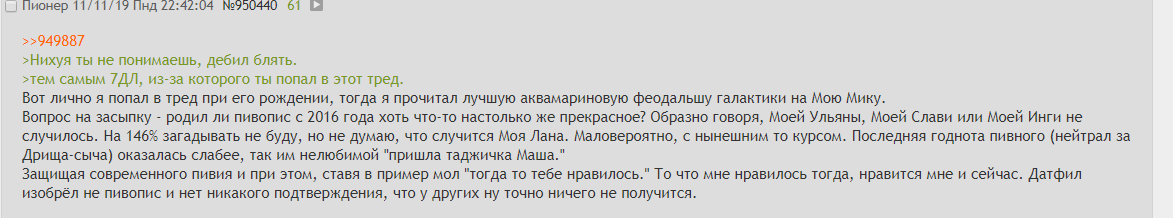 >>1235375 Я могу согласиться с мыслью, что в пиве бывает много моментов, где героини говорят именно речью пивописа. Но этот диалог в этом плане не так плох