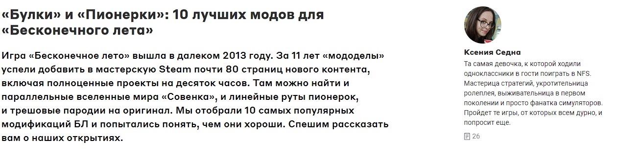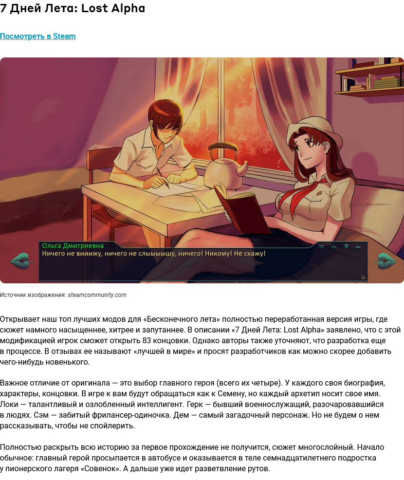 Тред самого крупного мода для Бесконечного Лета. С 2019-го есть две версии: в мастерской Стима от энтузиастов (Lost Alpha) и авторская от 7дл-куна. Новичку начинать со стимовской Лост Альфы, именно её обсуждают в треде.