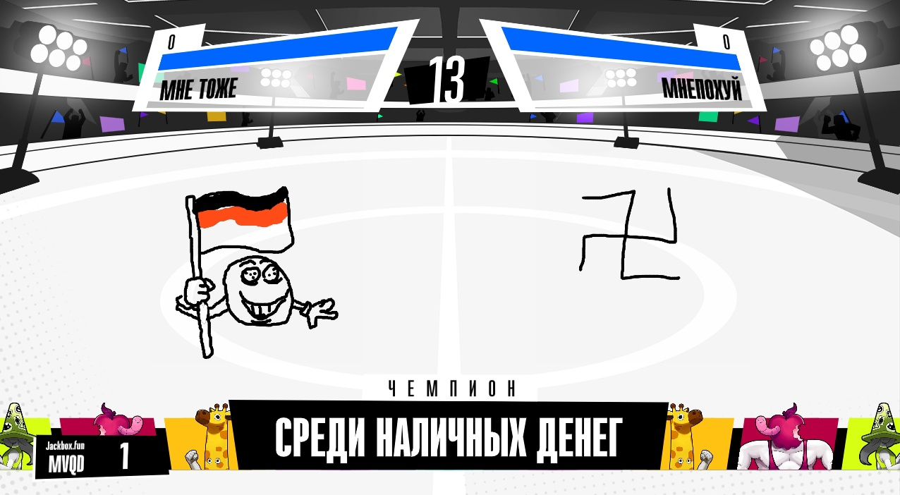 Например гладиарторы (не самый лучший пример, но все же) Раунд 1 В первом раунде игроки рисуют два типа бойцов, которые будут биться в сражениях: "чемпиона" и "аутсайдера" (противника). Рисуя "чемпиона", вы будете знать только за какой титул он будет сражаться, например, "Чемпион среди трусов". Рисуя "аутсайдера", вы будете знать только против какого персонажа он будет биться, что может помочь в создании своего бойца. Затем игроки будут голосовать за то, какой боец лучше подходит для того, чтобы стать чемпионом своих титулов. Если число голосов равняется 50/50, то по умолчанию побеждает аутсайдер.