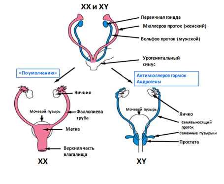 >У всех плодов (и мальчиков, и девочек) вырастает мюллеров проток. У девочек этот проток обычно развивается в женские половые органы. У мальчиков, с другой стороны, их гены вызывают высвобождение белков, которые разрушают этот проток, так что он не развивается дальше.