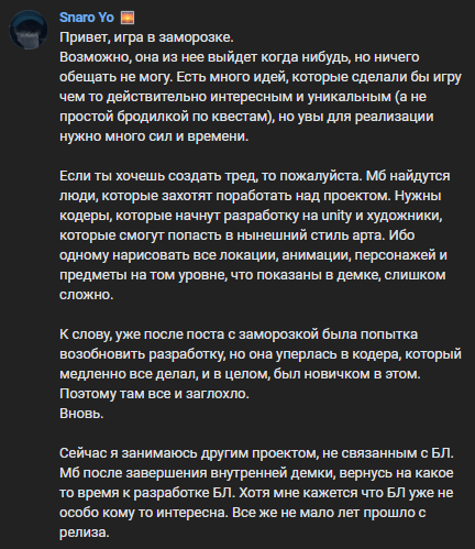 Что касается первой игры, то её команда столкнулась с острым дефицитом кадров. Игра всё-таки может продолжить разрабатываться и таки выйти в свет, но только если к команде присоединяться: - Программисты и люди с опытом работы на движке юнити для работы над технической частью. - Художники. - Поддержка сообщества.