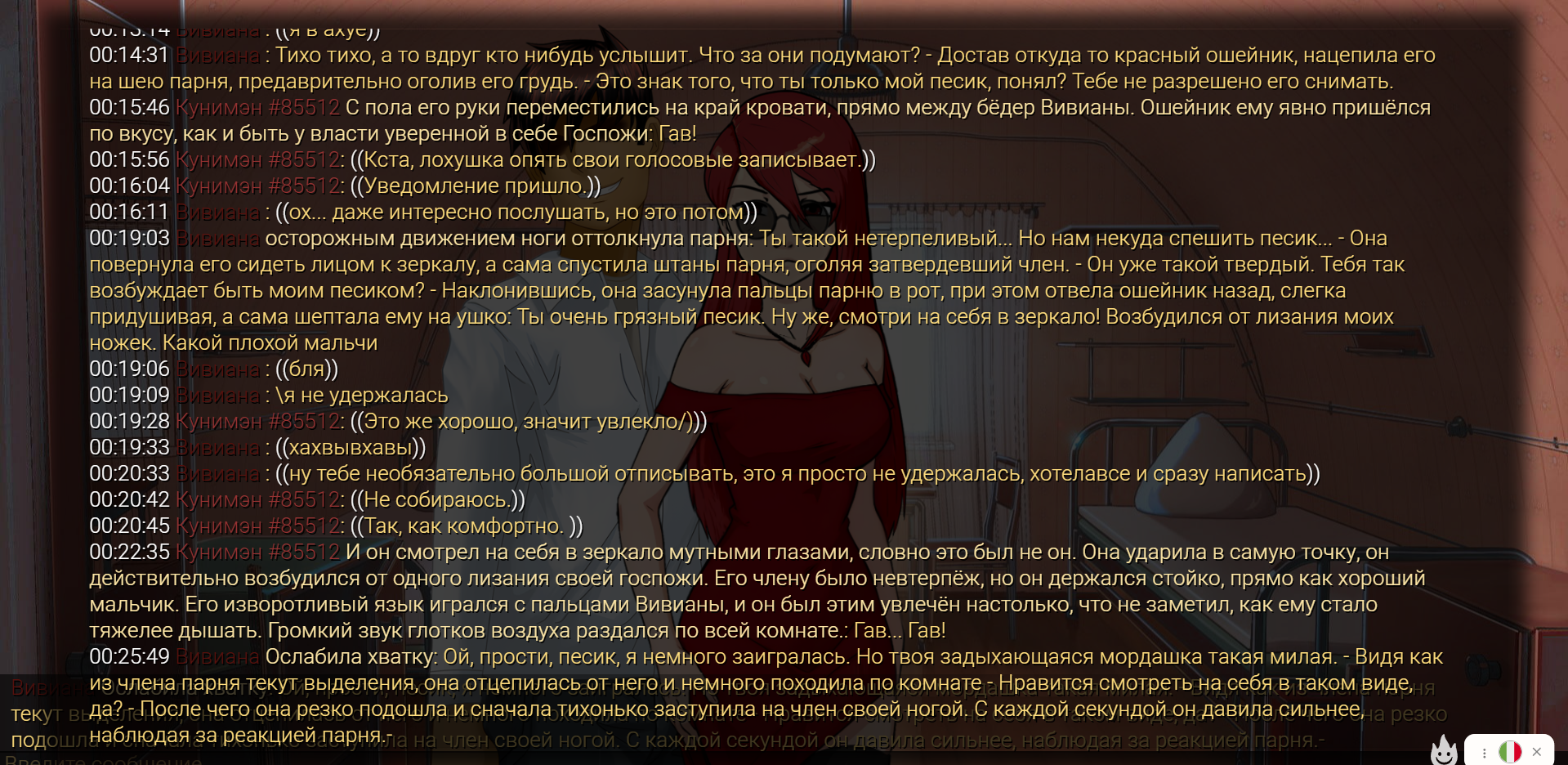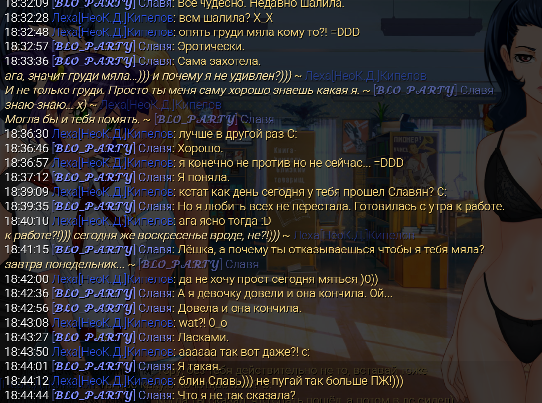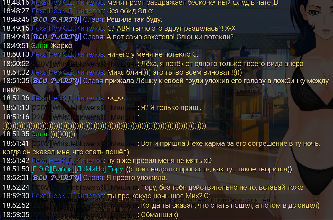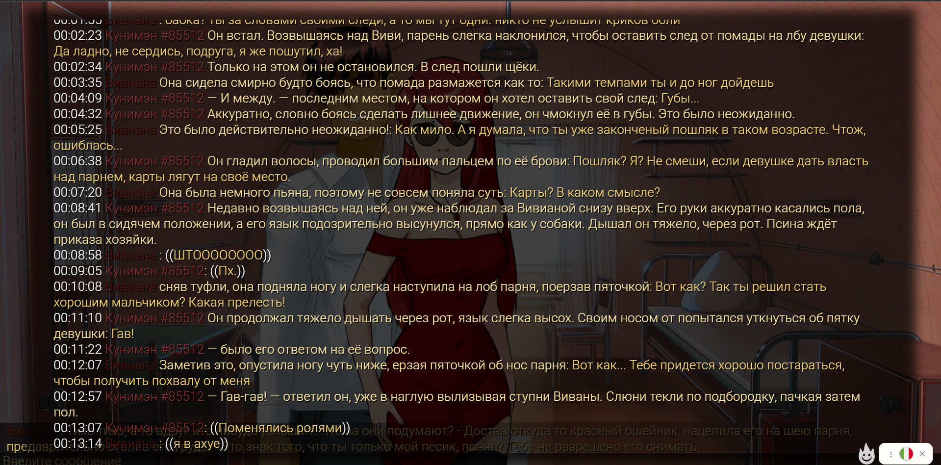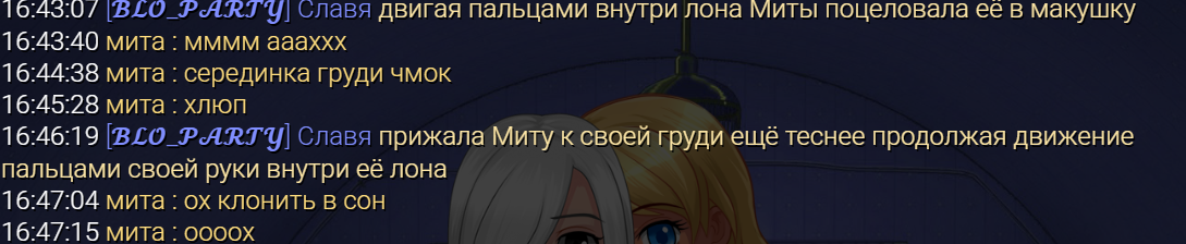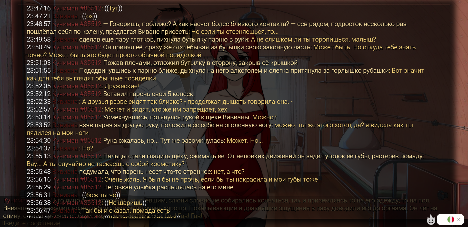 Старина Бо Синн (а это, конечно же, был он) развернул такое описание, что текстовый чат загорелся красным. Каждое слово проникало в душу, каждое движение героев описывалось с мастерством романиста. Кто-то скромно покидал комнату, не выдержав натиска эротических метафор. Другие записывали это в цитатники. Кульминация