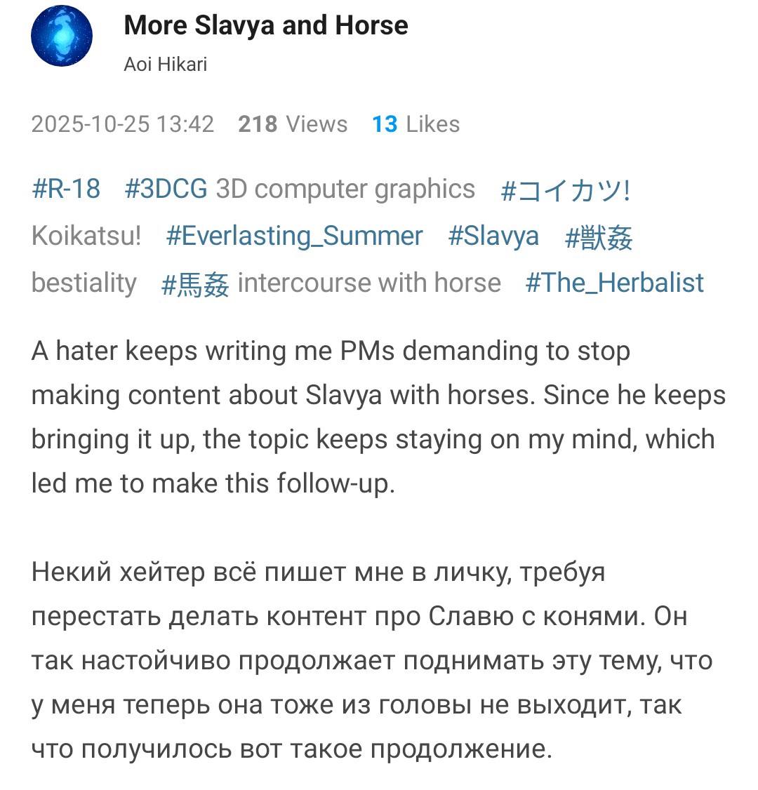 >>1249226 >А нахуя тебе новые видео на ютубе смотреть? Ты их не конспектируешь, ничего нового и полезного не узнаешь. Пиздец. Ты сейчас серьезно? Ты реально сравниваешь кучу информативных видео по огромному количеству сфер знания с горой неинформативного нейрокала по одной и той же вн-ке с одними и теми же персонажами? Что с тобой не так, жертва тиктока? >Поток свежего контента Зачем? Ты не можешь представить пионерку в костюме горничной, и тебе нужен десяток нейрогенераций для такого? У тебя с головой что-то не то. Хотя о чём это я: >Нет фантазии Хочешь тебе секрет расскажу? Есть тысячи других вн-ок с новыми персонажами, новыми эмоциями. Не обязательно быть глупым, ленивым уёбищем, 12 лет затирающим пионерок до дыр. >>1249232 В исторически правильную. >>1249231 Нтр-вырожденцев никто не спрашивал. Лучше иди своему папке помоги днк-тест сдать. >>1249228 >думаю, и то и другое - у тебя. Мне не так сложно сгенерить арт с кониной, Не сомневаюсь. Вопрос тот же - зачем? Ты правда ради троллинга готов обосрать персонажа? Почему таким как ты неймеся и непременно надо превратить блето в цирк? >суть этих простынок сводится к "STOP HAVING FUN", что заведомо проигрышная позиция. Не вижу FUN в регулярном обсирании персонажей. Зато можно увидеть FUN в ст 242 ук рф, для которой ты уже наделал достаточно следственного материала, да еще и пишешь, наверное, с белого ip. Но я этого не делаю, поэтому прояви чуть уважения - если не ко мне, то к хуясе, который сделал и персонажа, и игру (из-за чего мы тут собрались). И который не является зоолюбом, как и его Славя.