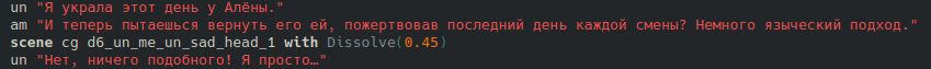 "Что могло дать первовещество в обмен на изломанную, искалеченную душу?" "Учёные из научного центра обвинили бы во всём отмершие нейроны, многоликая проводница со Старой Дороги – грубые отпечатки чужих душ.{w} Но суть не изменится: созданный мир не был похож на мир чьей-то мечты." scene bg ext_city_night_7dl with dissolve "Он был холодный и серый, наполненный горечью и страданиями.{w} Всё яркое слишком сильно напоминало о старой боли." scene bg ext_city_night2_7dl with dissolve "В этом скучном и серьёзном мире не осталось места сказкам. {w}Здесь не знали о Старой Дороге, не запускали кораблики, а паре людей, неведомым чудом получивших синдром ПСР, диагностировали диссоциативное расстройство идентичности." scene $ renpy.show("bg ext_winter_night_7dl", what = Dawn("bg ext_winter_night_7dl")) with dissolve "В этом страшном и гнетущем мире постоянно шли войны, и Советский союз не выстоял в столь тяжёлых условиях, распавшись на разные страны.{w} Здесь никто не строил иллюзий и не верил в счастье."