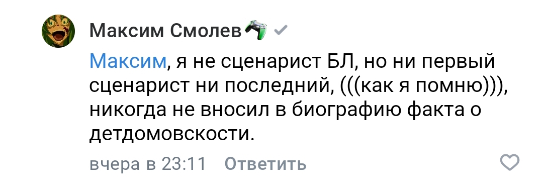 Кстати, щас вот подумал. Смолев сказал что не помнит чтобы сценаристы вносили факты о детдоме. Мысли: 1) не помнит написал с шестью скобками, наверное не факт что не было фактов, просто (((не помнит))) 2) он сказал факты. Значит (возможно) факты были. 3) может Алиса уже не была детдомовская, но её прототип двачетян и тп была 4) Алиса детдомовская 5)... 6) профит