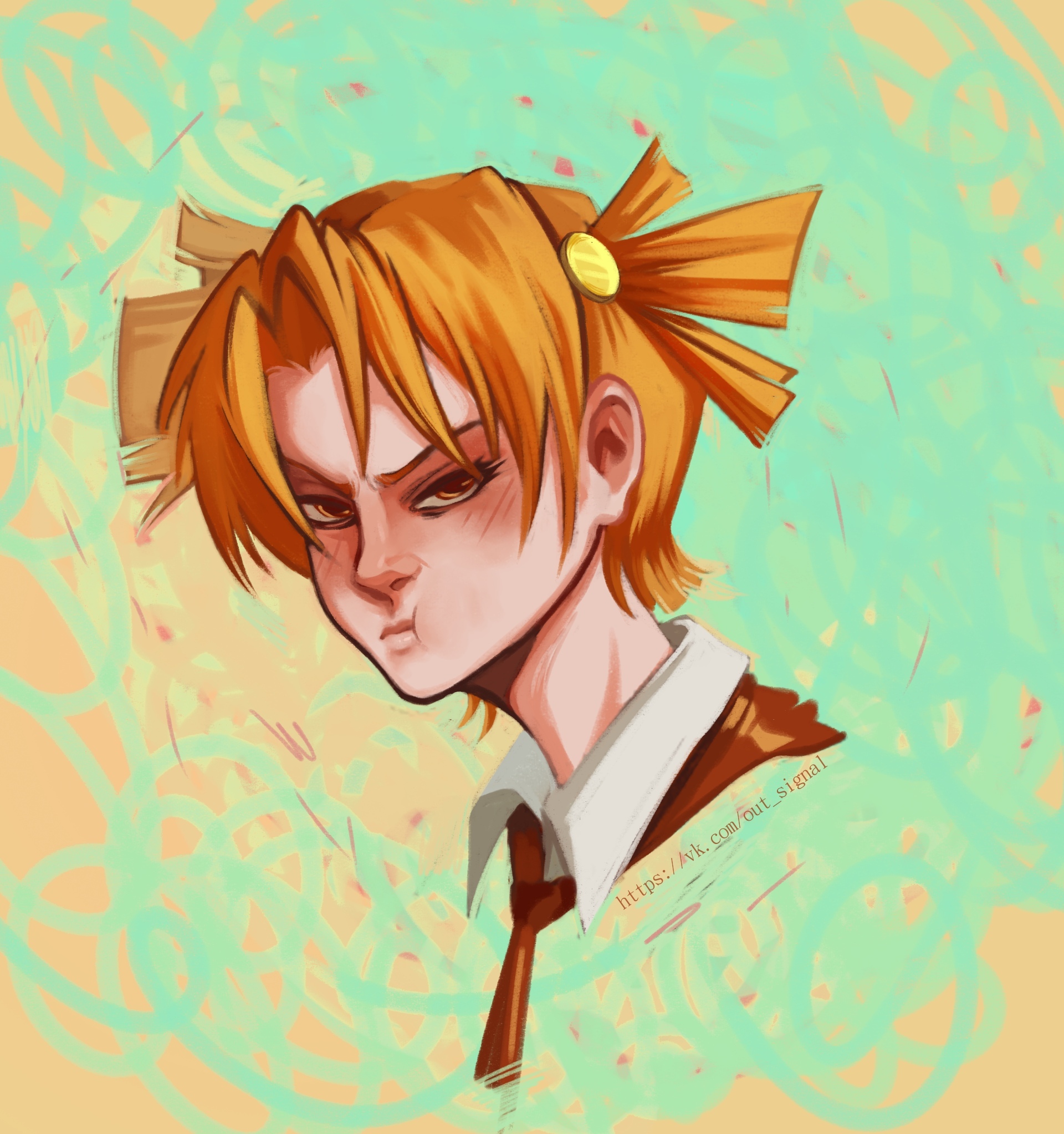 ярко‑рыжие волосы, заплетённые в два коротких хвоста; янтарные глаза; рост ~168см; худая фигура.