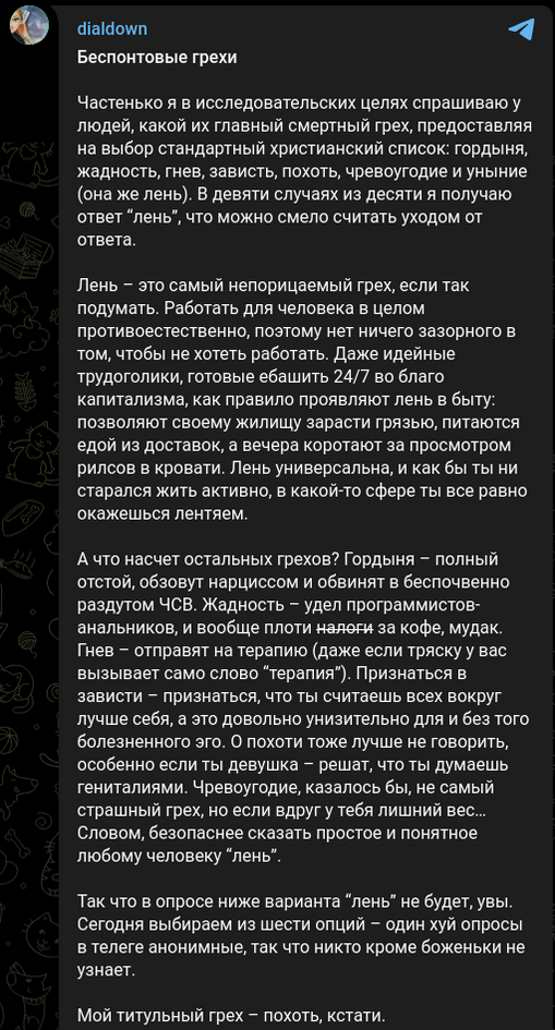 >Если автор не может простыми словами и лаконично донести суть мысли Не в защиту Пивописа - он долбо3б это все и так знают, но тебе никто ничего не должен. В LA все объяснили, если чет не понял то skill issue. Если же про релиз 7дла говорить, то до выхода Ульянки и Одиночки читать можно было вполне нормально и руты не так сильно выбивались из коллеи общего повествования.
