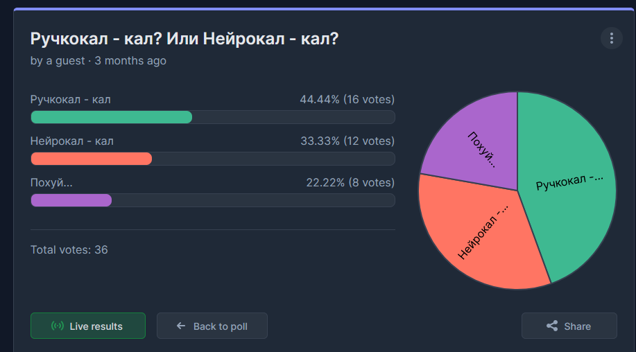 Ну и нейрофобия твоя странная. Нейронки так или иначе сейчас будут юзаться примерно в любом контенте. Вопрос только в том, совсем ли он нейрослопово выглядит, или приемлемо. Этот контент выглядит прилично - значит, по умолчанию считаем его честным. А как иначе? Иначе - это подозревать всех и во всем, но тогда и наш разговор придется считать диалогом двух ботов.