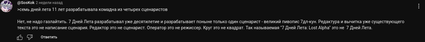 даже те хвалят обычно этот мод можно услышать что он бессмысленно раздутый, выборы не очевидны, персонажи отличаются в зависимости от ветки/рута. просто вдумайся как сложно сделать хорошую новеллу с 5 рутами. А в 7дл их сколько? Зачем всё это разнообразие, я не верю что вам заходит читать каждую ебучую концовку где семён добрал или не добрал 1 лп на выборе который хуй найдёшь, в оригинале этого было не так много. Я реально пытался вникнуть, но первые 3 дня игры сюжетно не отличаются от ритановских, а затем просто начинается дом2 будто в пределах лагеря или за его пределами. В 7дл в лагере нет реально интересных событий, которые бы удивляли, ритан хотя бы написал(или может спиздил) поход в старый лагерь, дискотеку, славю которая голая шароёбится где-то. А что может своего предложить 7дл? Про фантастику/мистику вообще молчу, это бесконечное нагромождение хуйни которое автор пишет когда не может нормально написать сюжет.