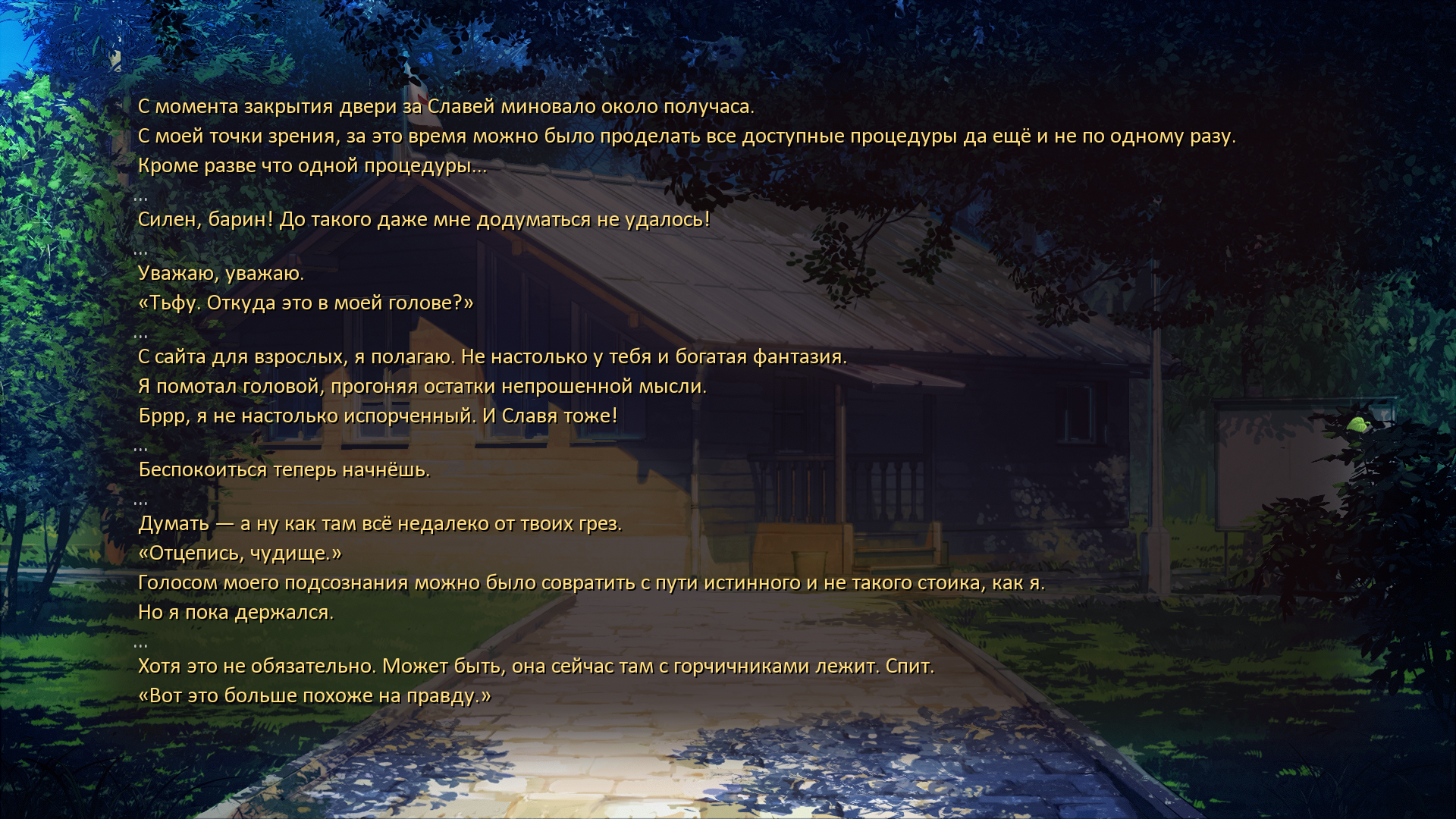 >>1255830 Авторы "наслаждаются графоманией", а я вот не очень. Мне интересны персонажи, их чувства, реакции. А читать объяснения неканоновых сюжетных переплетений такое себе. Можно придумать сотню способов, как Семён попал к Славе в параллельный мир. Например его укусил просветлённый комар и Семён в миг достиг Самадхи, научившись перемещаться по мирам. Вообще не имеет смысла как и что. А вот характеры персонажей это канон и они сделаны великолепно! Просто на 11 из 10! Вот это самое ценное, а не ебучие часовые разговоры с пионерами про бутылочку там, концертики (которые в руте Слави, в отличие от рута Мику, нахрен не нужны имхо) и всякую отвлекающую хрень абсолютно никак не влияющую на сюжет. Ну или почти не влияющую. Авторы конечно молодцы, что написали столько текста, лучше так чем никак, но не для меня. Во время базара пропадает атмосфера и уже не чувствуется настроение. Я заметил что крупные моди этим страдают, то есть читаешь читаешь такой, а потом ХОБА и начинается вообще не по теме какието качели. Может сценарист меняется, может кусками сценарий копипастят для чего-то. Ну чувсвтуется. Отлекает. и тут приходит на помощь его величество СКИП. зажал кнопку и ты уже снова погружаешься в что-то значимое...