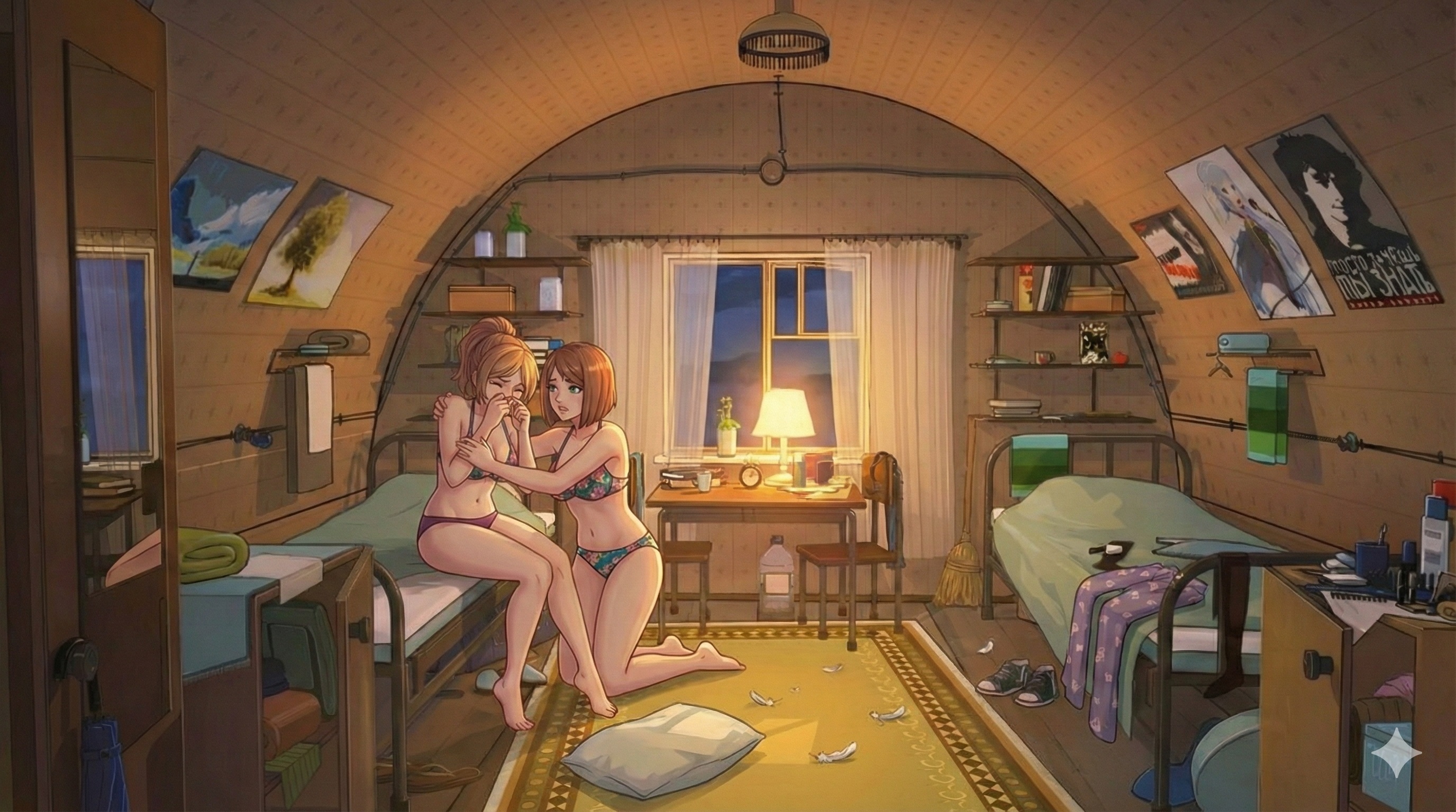 Один из вариантов сцены: Они в каткомбах около входа в бункер сделали минибазу, и долгое время пытаются открыть дверь. Хорошая сцена для того чтобы показать отчаяние пионеров, то как они с ним борются, поддерживают друг друга, ведь пути назад то нет. Ну и через какое-то время Semen открывает дверь, а сам каким-то образом откидывается на пол дня. Типа ударился + усталость + еду отдавал девочкам. Девочки его затащат внутрь и будут ухаживать и заботится за ним, проникаясь чувствами к нему, за что он для них делал всё это время. Нужна прям какая-то жертва ради них. Чтото что Semen сделал такого рискового. Ну опять там волки может за ними в катакомбы свалились или еще какой дикий зверь (если не монстр). +1 момент для закрепления чувств между Семенем и девочками (ну которая по сути одна девочка как мы помним).