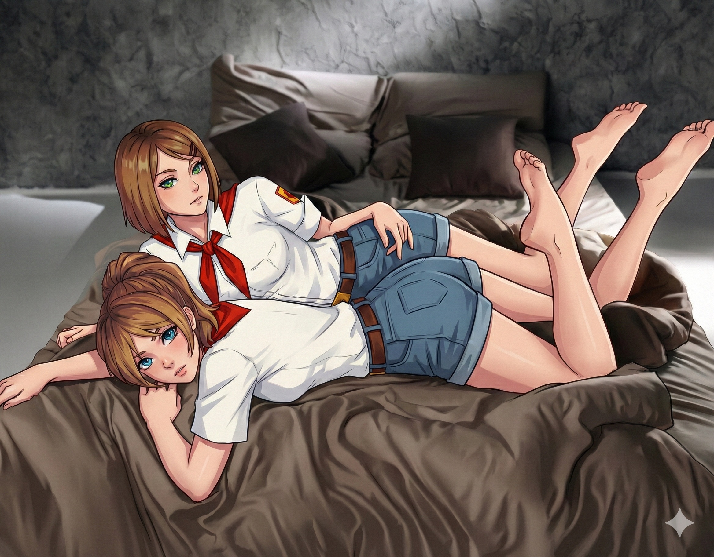 Это Соня и Настя, самые оригинальные пионерки Бесконечного Лета 2. Почему? Да потому что, на самом деле, это одна пионерка, которая при попадании в лагерь разделилась на две личности. (ну или еще есть версия, что это одна личность из двух параллельных вселенных, не суть).