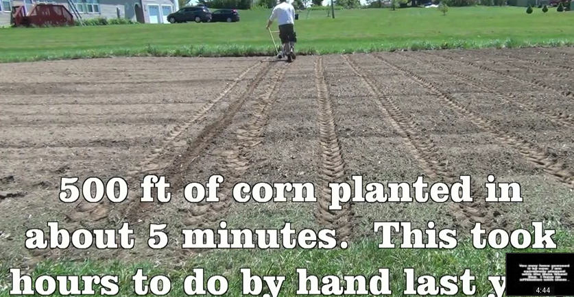 >>149216 >е надо горбатиться и втыкать каждое семечко в землю Чот урывкам видео смотрел, и тут увидел пикрелейтед. 150 метров кукурузы за 5 минут. При 0,3 м между растениями и 0,6м между рядами это площадь около сотки. То есть на сев(именно операцию сева, а не всего) уйдет 500 минут или 8 часов - рабочий день. А гектар кукурузы это 5 тонн зерна.