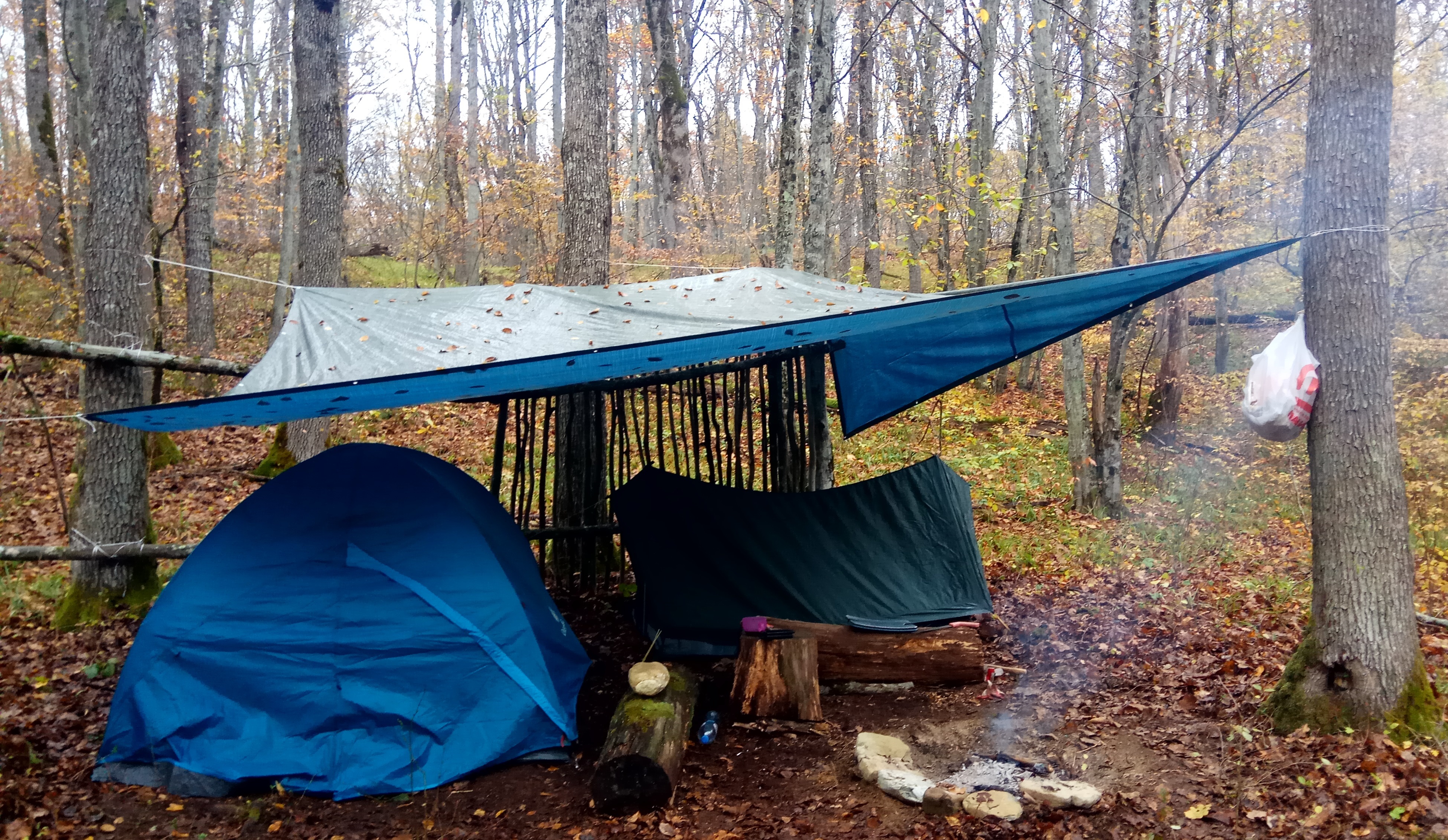 короче апдейт епт) сгоняли на 2дня и 2 ночи на наше место, поставили пару перекладин, натянули тент строительный 5х4м расчистили место под ним, нарубили еще балок и организовали небольшую стеночку. получилось немного не так как хотели, но все же уютно. Пока что под тентом ставили палатки там же притащили чурбаки аля стол и стулья. в декабре планируем еще выезд.