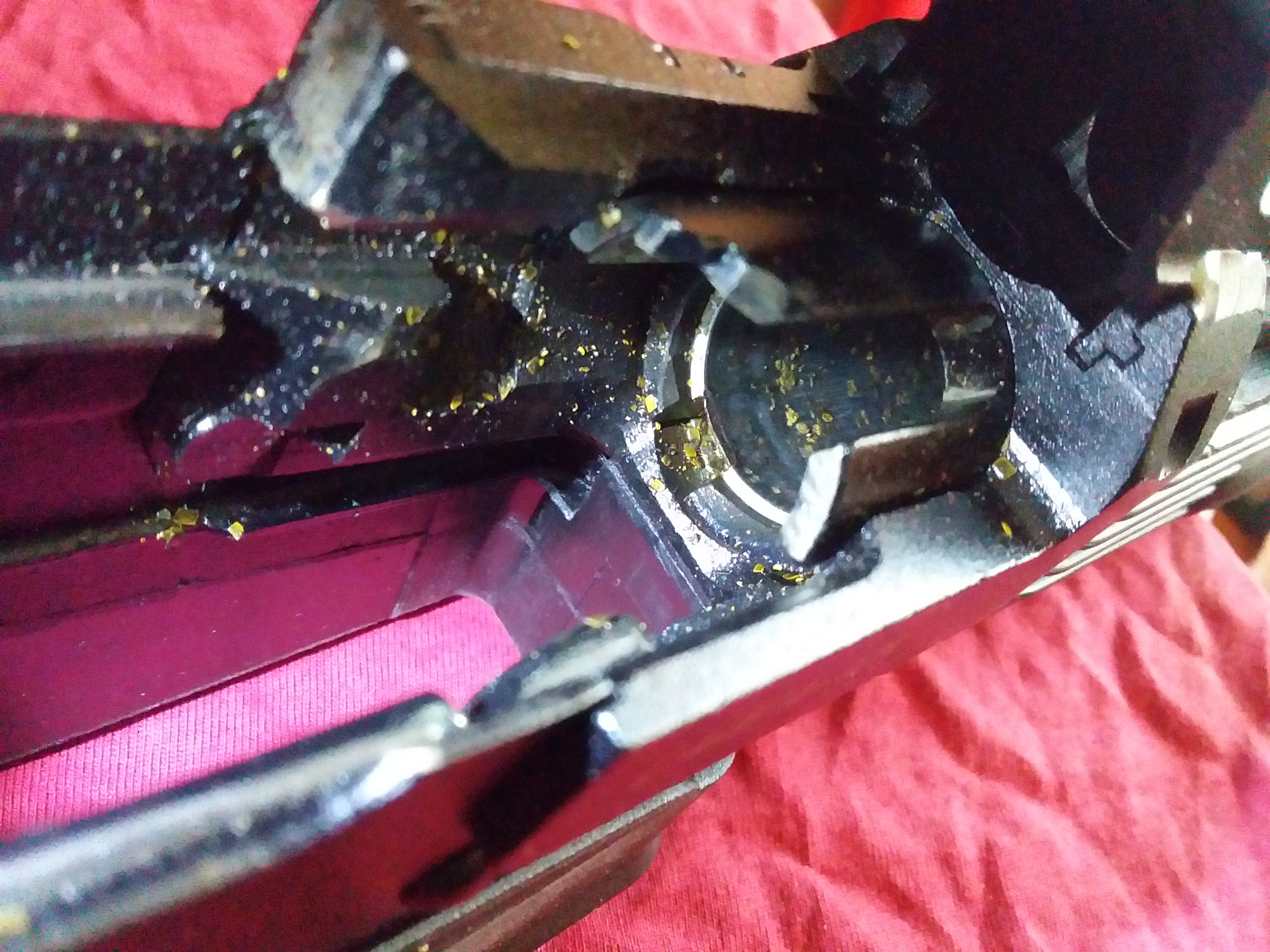 Так, погуглил. Да, в старых была дырка, в современных, которые 12к 030 там акашный газоотвод со своим поршнем. Вот у меня такая. Но я в назкамеру химией прыскаю, и изредка там латунной кисточкой еложу, когда говнопорохом постреляю типа этого - пик. Это сука Сокiл последней партии. Я 25 патронов выстрелил и сам охуел. Остальное с помпы дострелял, потому что об Сайгу всю вилку сточил.