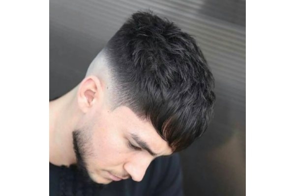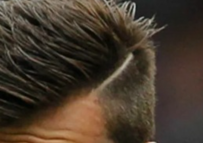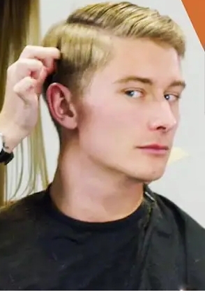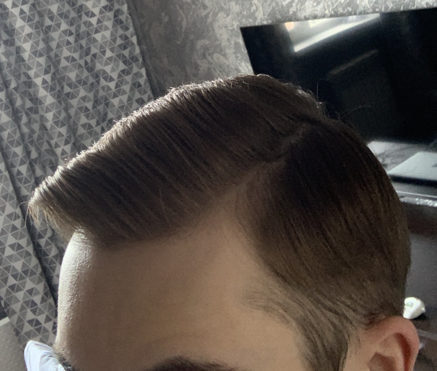 >>1810522 Сайдпарт с высоким выбриванием пробора и высоким фейдом. Прилизанная стайлингом назад вбок.