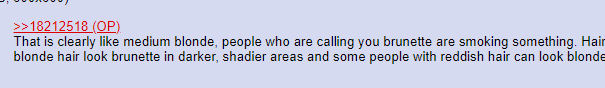 Бля какого у меня цвета волосы? Меня как только не обзывали, и "рыжий", и "каштановый", и "шатен", и "дарк/стробери блонд" и ещё какая-то дрисня типа auburn. Ну и какой оттенок ещё, светлый или тёмный? А то для краски для волос, как я понял, это важно, т.к. на условно светлых волосах некоторые тона будут слишком яркие, а на условно тёмных эти же тона будут... тёмными.