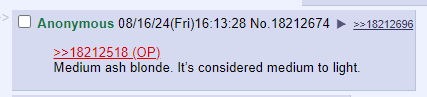 >>1816051 я хз, что такое "русые" волосы. Это зонтиковый термин. Я видел блондинов, которых называли "русыми", и видел людей с тёмно-каштановыми волосами, которых тоже записывали в "русых". И каштаново-рыжих тоже в т.н. "русых" записывали. Ну, на форче мне уже местные ответили, что я medium blonde, такой ответ меня больше устраивает, т.к. он более конкретный, поэтому вопрос снимается.