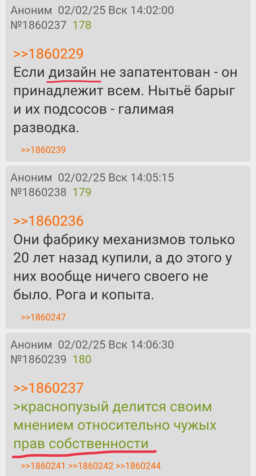 >>1860309 >>краснопузый делится своим мнением относительно чужых прав собственности Это твои слова. Какие права собственности на незарегистрированный дизайн?