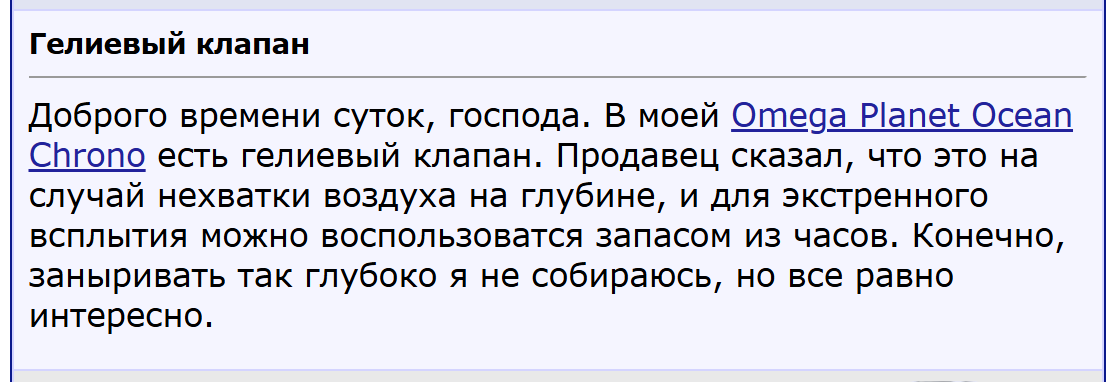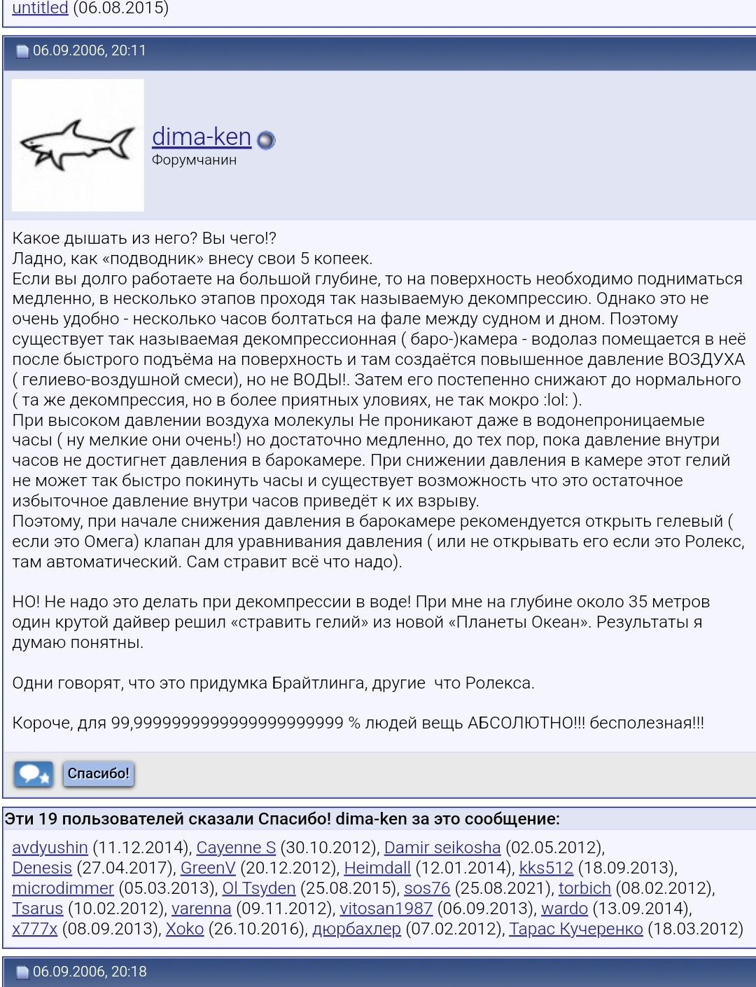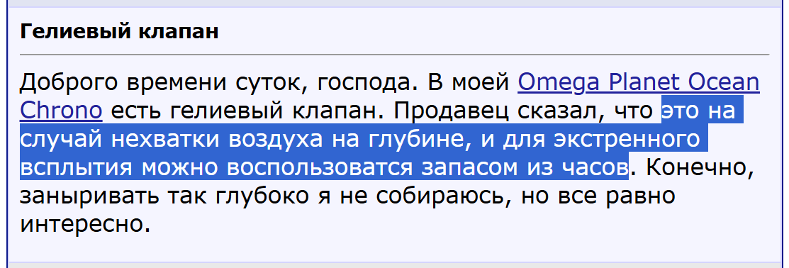 >>1860511 >А можно было лишь просто загуглить это В гугле и была ссылка на форум с крупными экспертами. И там пишут, что в ходиках с клапаном есть запас воздуха на случай нехватки на глубине. Моего там только расчёты и предположение, что для потребления воздуха статусный господин совмещает клапан с ротовым отверстием. Если я ошибся, и статусный господин должен прикладывать клапан к другим отверстиям, то поправь пожалуйста.