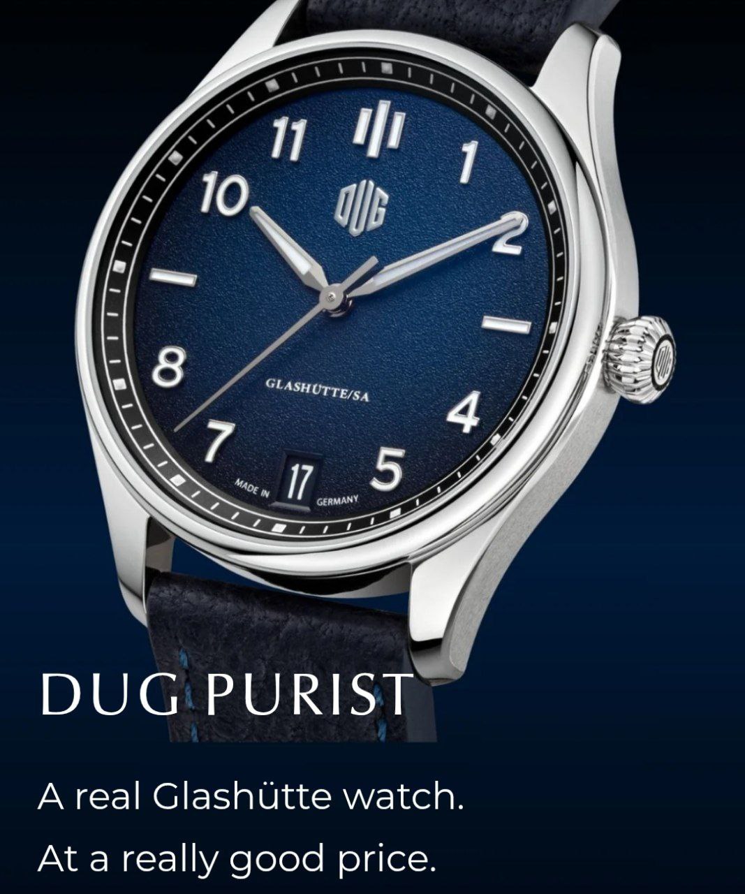 Нет, это не Nomos, а DUG (Deutsche Uhrenmanufaktur Glashütte). Всего за 1000€ вы получаете часы с заветной надписью Glashütte на циферблате.