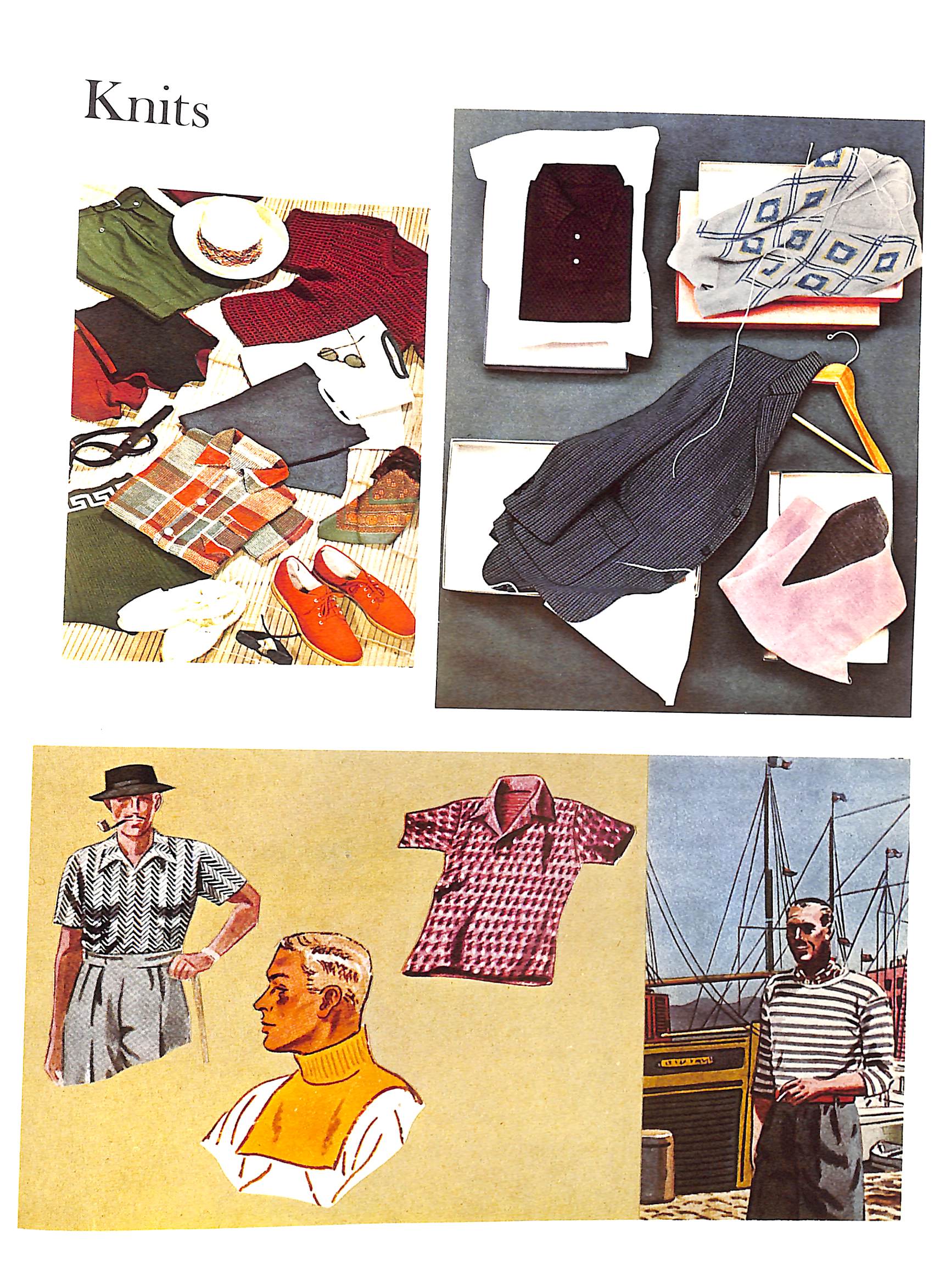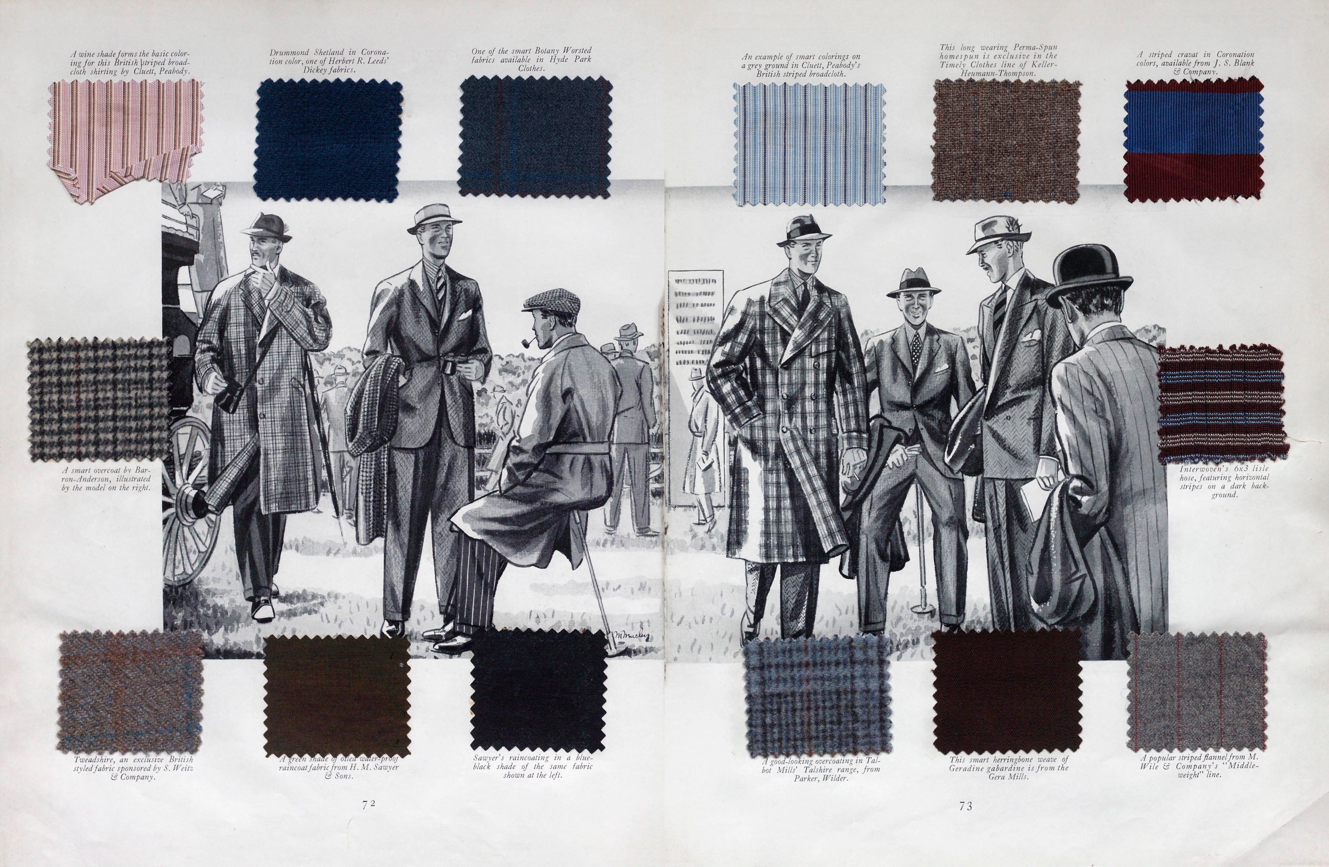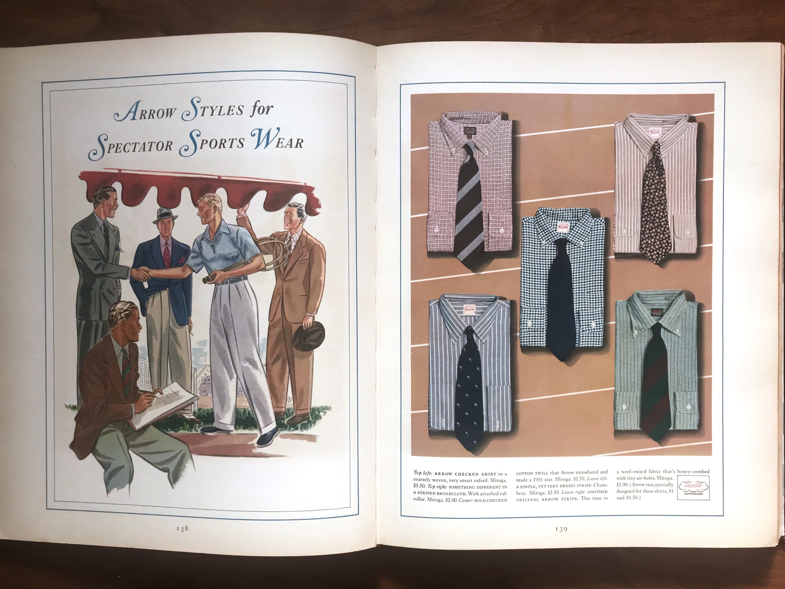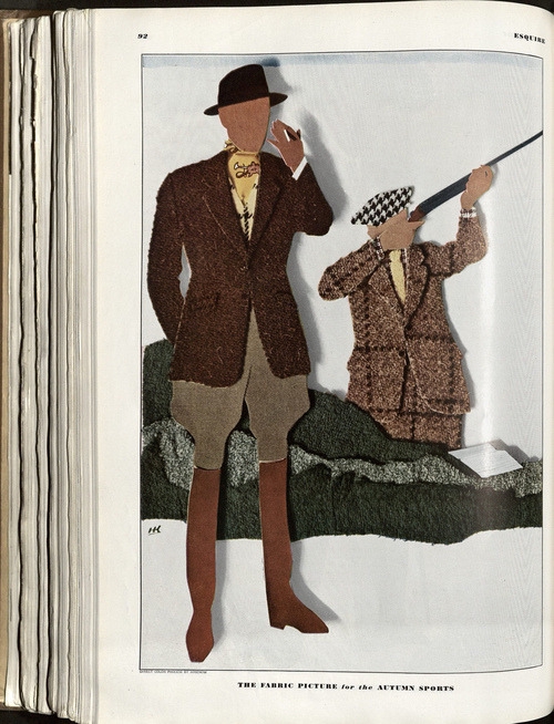 В эпоху без Твиттера, лукбуков и Скотта Шумана, продавцам приходилось как-то выкручиваться и AA выступил замечательным помощником. Из приколов: вы не найдете там ценников. Никаких "Shirt by Kiton $475; Tie by Brioni $185". Просто тексты о том, как одеваться в различных условиях. Казалось бы, что ещё надо. Но помимо многочисленный иллюстраций, на некоторых страничках были приклеены образцы ткани. Особенно красивы вырезанные из материалов фигурки.