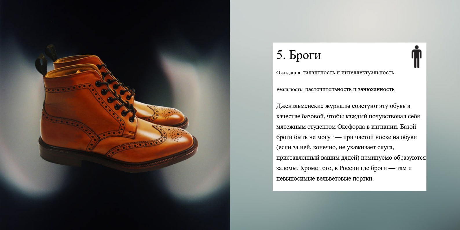 что меня отталкивает во всех подобных текстах — это их категоричность. это нельзя, это можно, тут вот так, здесь голубое с бежевым, а тут повседневный пиджак. окей, а судьи кто? Катя Герасичева. збс. или посмотрите на другой текст рядом по ссылке (и оцените аргумент про заломы на брогах) https://w-o-s.ru/article/8258