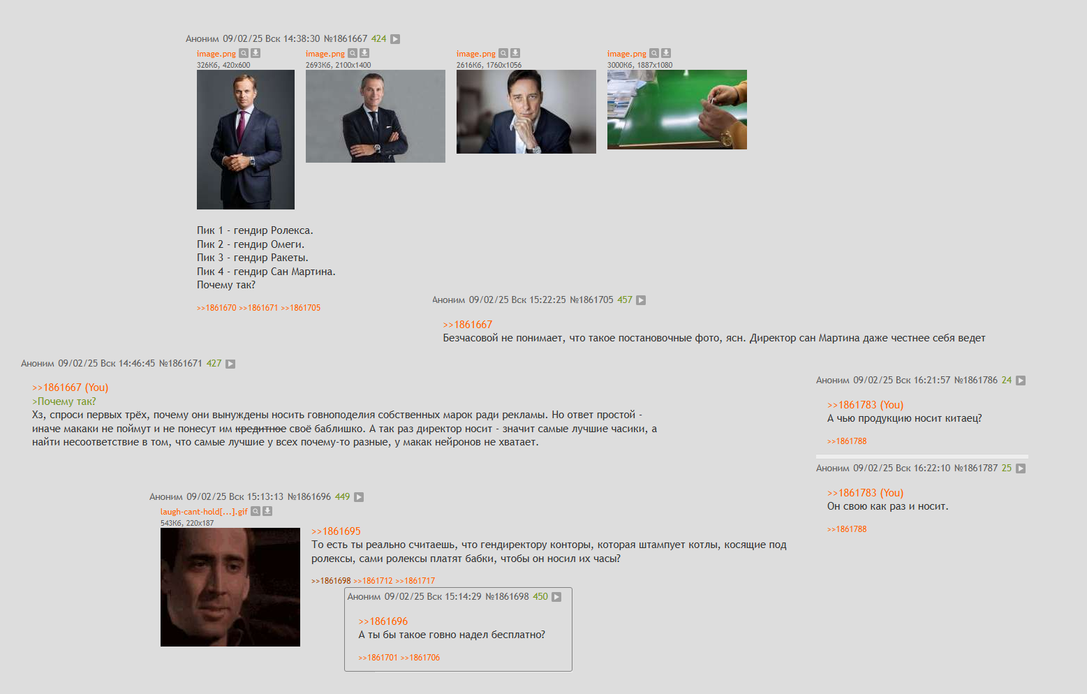 >>1861831 Гендиры крупных часовых компаний носят продукт, который их компании производят. От ролекса до какеты и инвикты. Что уж говорить про гендиров Касио и Сейки. Знают, что производят, и гордятся своим продуктом. А гендир сан мартина не носит. Горемычный угол может найти тысяча и одну причину, почему дядя Ляо предпочитает на съёмках откровенно рекламного ролика носить золотые дэйдэйты за 40 килобаксов, вместо своих замечательных и разумных оммажей на ролексы и омеги всего за 150-200 бачей штука. То фотки всех остальных гендиров постановочные, и они ирл дидунцы с агелокерами носят, то коварные ролексы загнали бедного дядю Ляо в кабалу рекламного договора, платя ему за то, чтобы он носил дэйдэйты, то ваще не важно, кто там и что носит, и т.д. Но мозг горемычных припиздухов не способен даже представить того, что дядя Ляо просто брезгует носить это фуфло. И даже на съёмки для заграничного блогера припёрся в ролексах, прозрачно намекая на место своей продукции. И самое смешное, что вот такие горемычные долбоёбы, которые ищут максимум часов за минимум денег дешманский ролексозаменитель как раз профинансировали китайского Кабаныча, и купили ему всей толпой золотые ролехи.