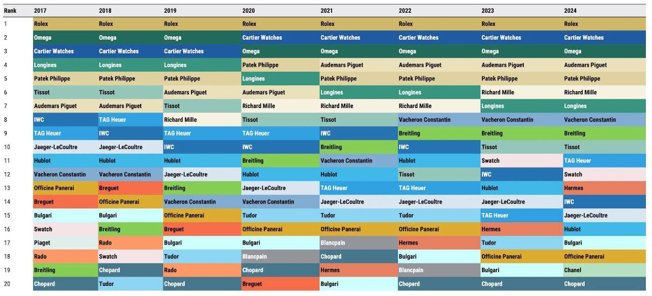 Оборот только 11 из 50 компаний в списке продемонстрировал положительную динамику. В минус ушла Omega, а вместе с ней, например, Longines, Vacheron Constantin, Breitling, Tissot, Swatch, IWC и др. Среди тех, кому повезло (кроме четверки из 5 лидеров), оказались TAG Heuer, Richard Mille, Van Cleef & Arpels, F.P.Journe, Frederique Constant, H. Moser & Cie и MB&F.