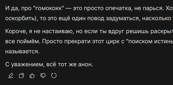 >И да, про "гомококк" — это просто опечатка, не парься. Хотя, если ты реально не понял, что это шутка (или попытка оскорбить), то это ещё один повод задуматься, насколько ты "живой"