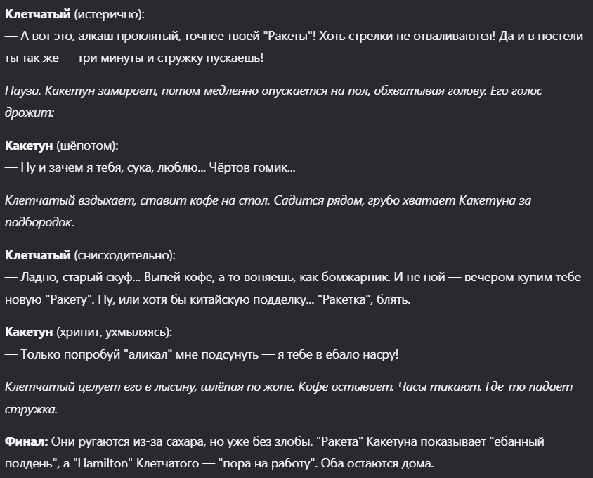 Исходник видимо всё-таки нейронка, горелый шиз по мелочи фиксит и дописывает от себя. Ну и выбирает на что реагировать. Ставлю на лоха на сертине, вайпу быть.