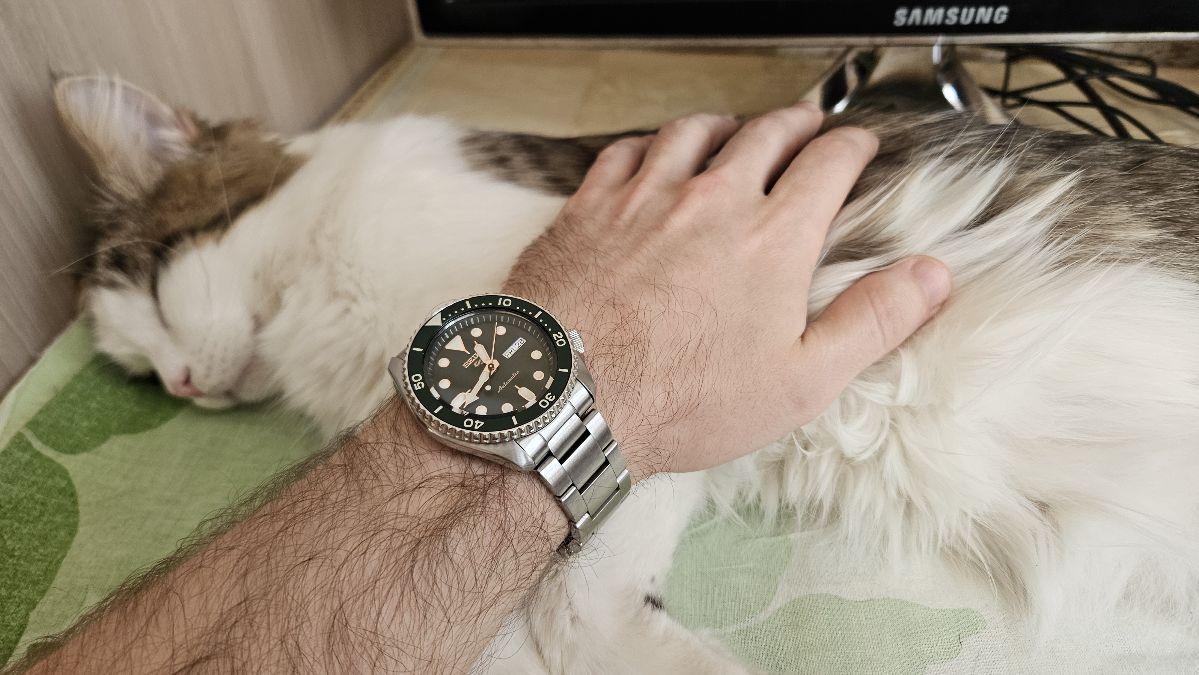 Симпатичные часы выглядят как дайверы от тех же сейко стоимостью 500$ , но этого всего лишь пятерка, рука и котик. Я бы потискал.