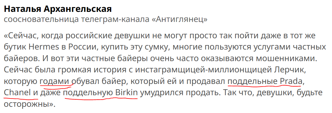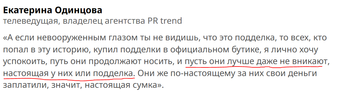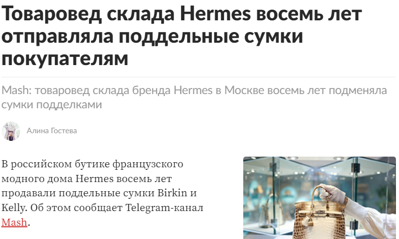 >По информации Mash, теперь Николина должна выплатить Hermes 599 тысяч рублей. Кроме того, ей необходимо заплатить государству штраф в размере 200 тысяч рублей. Также уточняется, что руководству бренда пришлось вызвать экспертов на склад с целью найти подделки и утилизировать их. Если черипикаешь, то хотя бы полностью историю скидывай Алсо если не уверен в оригинальности своего приобретения либо через сайт смотришь по индивидуальному коду, либо идешь в спец центр где тебе специалисты пояснят за шмот за страну производства
