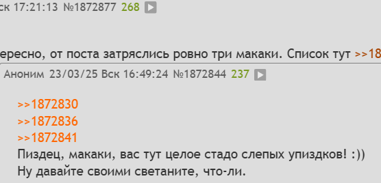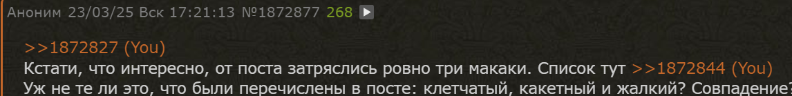 >>1872827 Кстати, что интересно, от поста затряслись ровно три макаки. Список тут >>1872844 Уж не те ли это, что были перечислены в посте: клетчатый, какетный и жалкий? Совпадение?