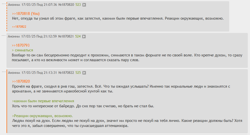 >>1872320 Иван, если это ты, я тебе объясню в чём проблема и как устроены девушки. Ты вот пишешь про 8/10, флирт и тд. Это не совсем правильное начало «увлечения женщинами». Чтобы понимать поведение человека - нужно для начала воспринимать его/ее как полноценную личность. Часто здесь вижу отношение к женщинам как к вещи, в лучшем случае к неполноценному человеку. В том числе и от тебя вижу подобное поведение. Как только ты начнешь относиться к девчонкам как к полноценному собеседнику - ты станешь понимать симпатию, знаки и невербальные жесты. Парфюм здесь даст небольшой бонус к положительному восприятию, если, конечно, он не вызывает негативных эмоций сам по себе. И, конечно, нужно помнить про вкусы. Но я ни разу не получал негативной реакции ни на один парфюм, главное знать меру и не вонять на все помещение. Поэтому я наношу парф на одежду - так запах держится дольше и в случае чего вещь можно снять, если переборщил.