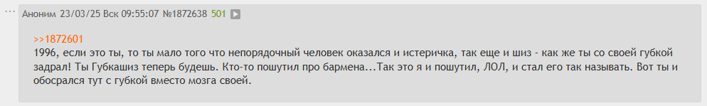 >Он открыто говорит, что мечтает тебя пермачем забанить, говорит, что всегда будет презирать и ненавидеть. Было бы славно, правда. А насчёт "всегда" - был бы Ванька человеком, а не вечно пиздящей губкой, я бы к нему может и нормально относился. Но к сожалению, он необучаем, за что получает пиздов как от меня, так и от других. В этом всём нет ничьей вины, кроме его собственной.