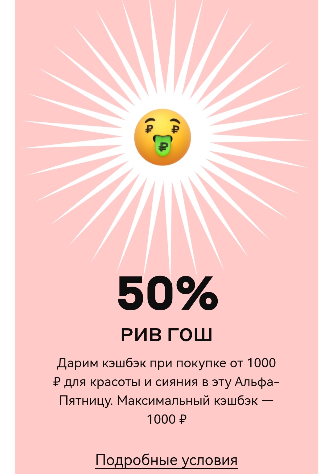Короче. В банке известном в акции "пятничный кэшбек" попалась скидка 50 процентов в Ривгоше. Завтра нужно совершить покупку на сумму от 1к, тогда тебе кэшбек вернётся, но не более тысячи.